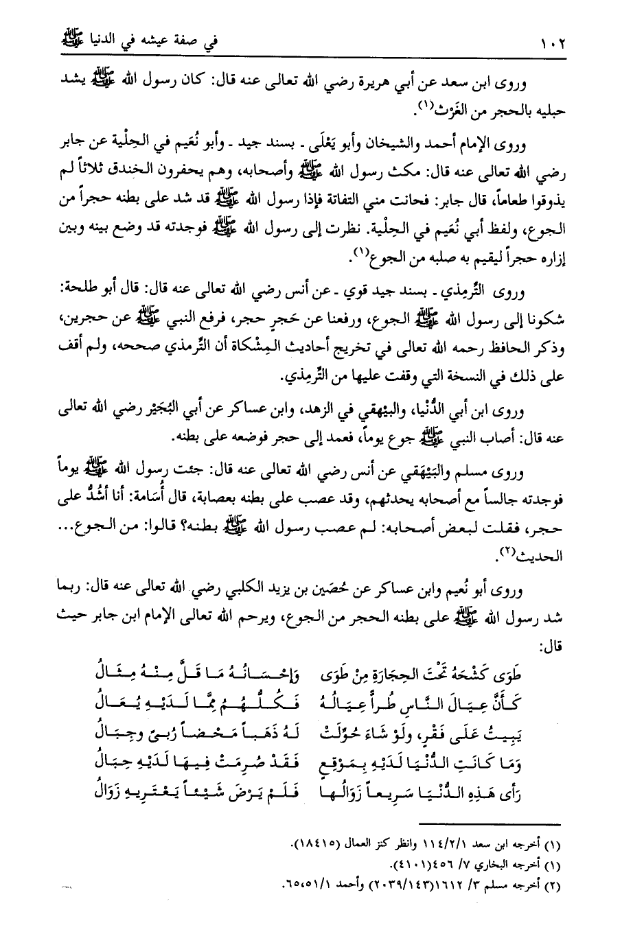 وروى الإمام أحمد والشيخان وأبو يعلى- بسند جيد- وأبو نعيم في الحلية عن جابر رضي الله تعالى عنه قال: مكث رسول الله صلى الله عليه وسلّم وأصحابه، وهم يحفرون الخندق ثلاثا لم يذوقوا طعاما، قال جابر: فحانت مني التفاتة فإذا رسول الله صلى الله عليه وسلّم قد شد على بطنه حجرا من الجوع، ولفظ أبي نعيم في الحلية. نظرت إلى رسول الله صلى الله عليه وسلّم فوجدته قد وضع بينه وبين إزاره حجرا ليقيم به صلبه من الجوع [ (2) ] .