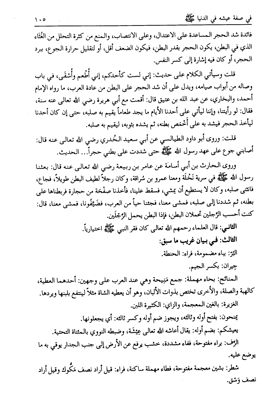 في باب وصاله من أبواب صيامه، ويدل على أن شد الحجر على البطن من عادة العرب، ما رواه الإمام أحمد، والبخاري، عن عبد الله بن عتيق قال: أقمت مع أبي هريرة رضي الله تعالى عنه سنة، فقال: لو رأيتنا، وإننا ليأتي على أحدنا الأيام ما يجد طعاما يقيم به صلبه، حتى إن كان أحدنا ليأخذ الحجر فيشد به على أخمص بطنه، ثم يشده بثوبه، ليقيم به صلبه.
