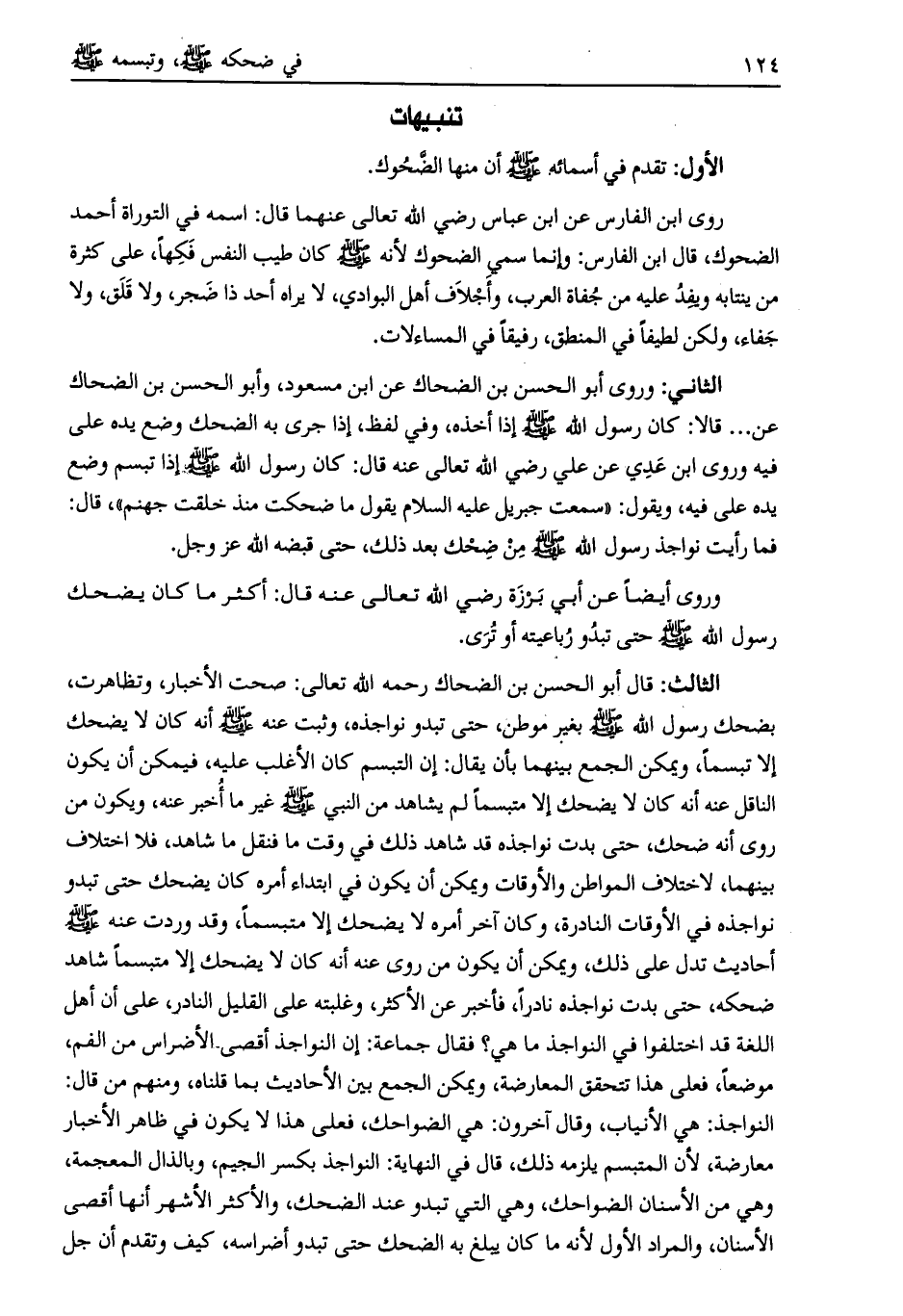 الثالث: قال أبو الحسن بن الضحاك رحمه الله تعالى: صحت الأخبار، وتظاهرت، بضحك رسول الله صلى الله عليه وسلم بغير موطن، حتى تبدو نواجذه، وثبت عنه صلى الله عليه وسلم أنه كان لا يضحك إلا تبسما، ويمكن الجمع بينهما بأن يقال: إن التبسم كان الأغلب عليه، فيمكن أن يكون الناقل عنه أنه كان لا يضحك إلا متبسما لم يشاهد من النبي صلى الله عليه وسلم غير ما أخبر عنه، ويكون من روي أنه ضحك، حتى بدت نواجذه قد شاهد ذلك في وقت ما فنقل ما شاهد، فلا اختلاف بينهما، لاختلاف المواطن والأوقات ويمكن أن يكون في ابتداء أمره كان يضحك حتى تبدو نواجذه في الأوقات النادرة، وكان آخر أمره لا يضحك إلا متبسما، وقد وردت عنه صلى الله عليه وسلم أحاديث تدل على ذلك، ويمكن أن يكون من روى عنه أنه كان لا يضحك إلا متبسما شاهد ضحكه، حتى بدت نواجذه نادرا، فأخبر عن الأكثر، وغلبته على القليل النادر، على أن أهل اللغة قد اختلفوا في النواجذ ما هي؟ فقال جماعة: إن النواجذ أقصى الأضراس من الفم، موضعا، فعلى هذا تتحقق المعارضة، ويمكن الجمع بين الأحاديث بما قلناه، ومنهم من قال: