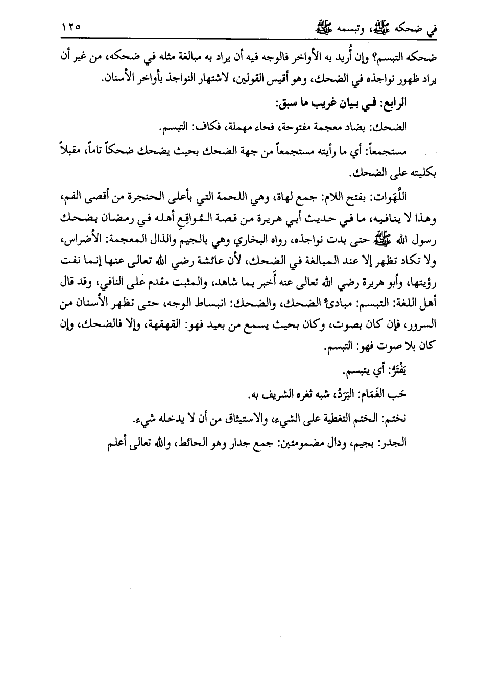 اللهوات: بفتح اللام: جمع لهاة، وهي اللحمة التي بأعلى الحنجرة من أقصى الفم، وهذا لا ينافيه، ما في حديث أبي هريرة من قصة المواقع أهله في رمضان بضحك رسول الله صلى الله عليه وسلم حتى بدت نواجذه، رواه البخاري وهي بالجيم والذال المعجمة: الأضراس، ولا تكاد تظهر إلا عند المبالغة في الضحك، لأن عائشة رضي الله تعالى عنها إنما نفت رؤيتها، وأبو هريرة رضي الله تعالى عنه أخبر بما شاهد، والمثبت مقدم على النافي، وقد قال أهل اللغة: التبسم: مبادئ الضحك، والضحك: انبساط الوجه، حتى تظهر الأسنان من السرور، فإن كان بصوت، وكان بحيث يسمع من بعيد فهو: القهقهة، وإلا فالضحك، وإن كان بلا صوت فهو: التبسم.