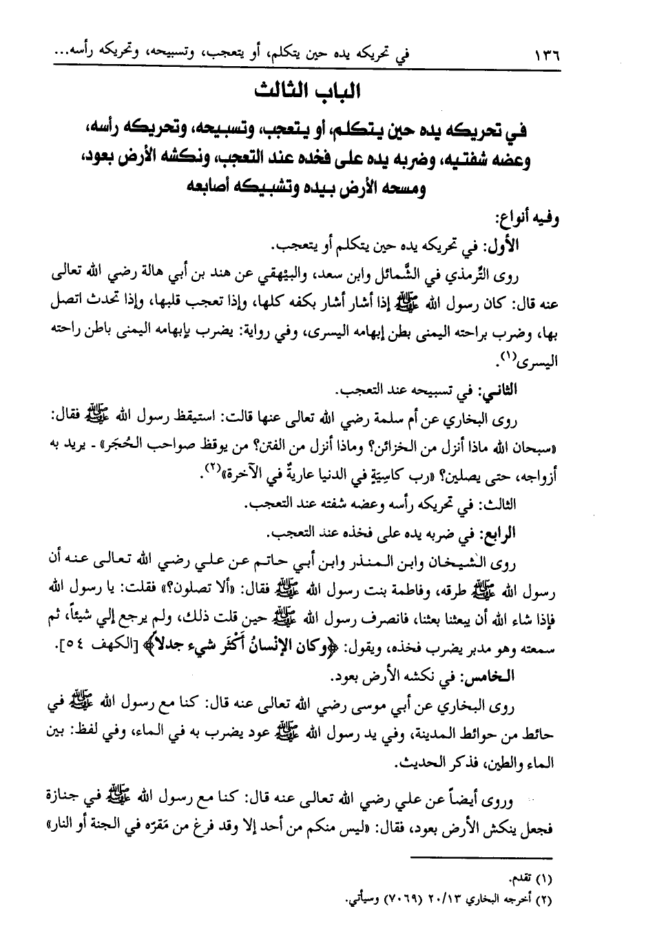 الباب الثالث في تحريكه يده حين يتكلم، أو يتعجب، وتسبيحه، وتحريكه رأسه، وعضه شفتيه، وضربه يده على فخذه عند التعجب، ونكشه الأرض بعود، ومسحه الأرض بيده وتشبيكه أصابعه