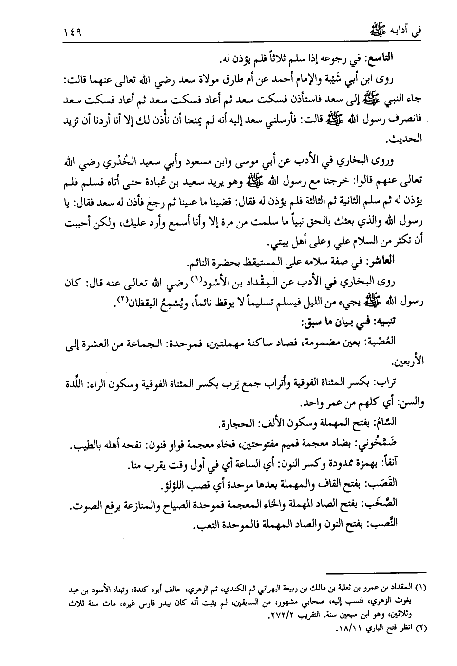 روى البخاري في الأدب عن المقداد بن الأسود [ (1) ] رضي الله تعالى عنه قال: كان رسول الله صلى الله عليه وسلم يجيء من الليل فيسلم تسليما لا يوقظ نائما، ويسمع اليقظان [ (2) ] .