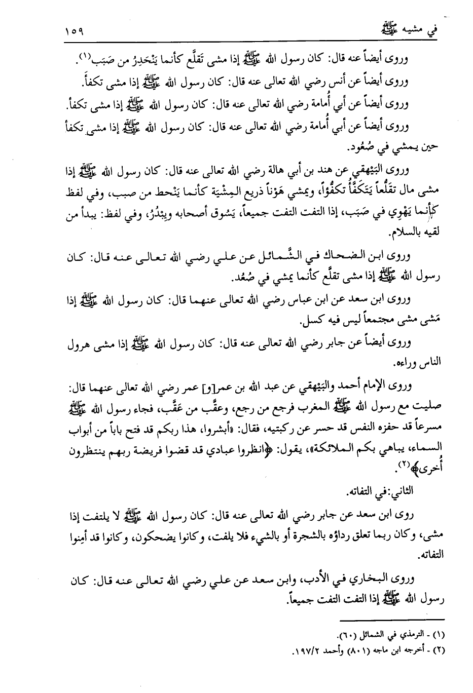 وروى البيهقي عن هند بن أبي هالة رضي الله تعالى عنه قال: كان رسول الله صلى الله عليه وسلم إذا مشى مال تقلّعا يتكفّأ تكفّؤا، ويمشي هونا ذريع المشية كأنما ينحط من صبب، وفي لفظ كأنما يهوي في صبب، إذا التفت التفت جميعا، يسوق أصحابه ويبدر، وفي لفظ: يبدأ من لقيه بالسلام.