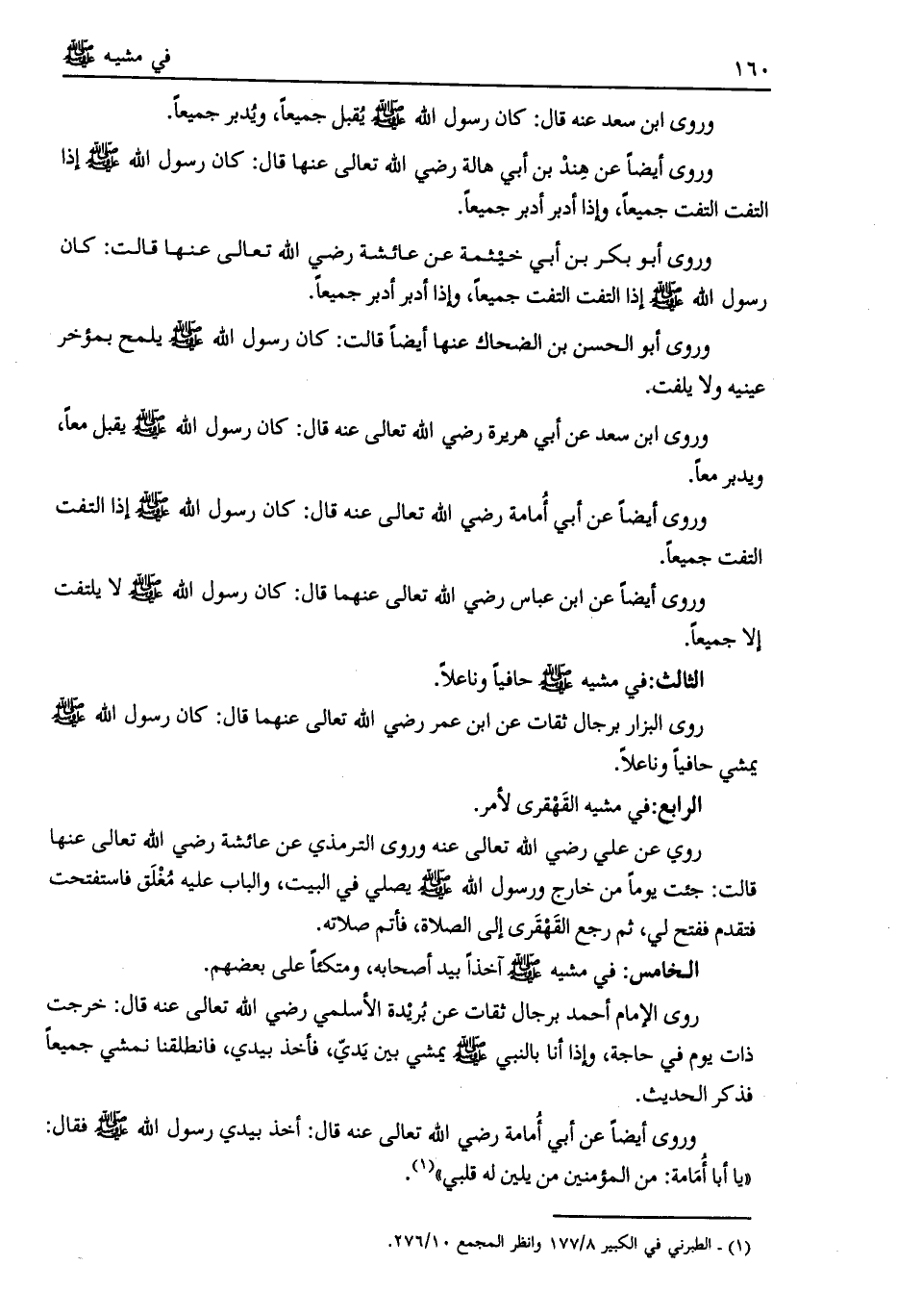 وروى أبو بكر بن أبي خيثمة عن عائشة رضي الله تعالى عنها قالت: كان رسول الله صلى الله عليه وسلم إذا التفت التفت جميعا، وإذا أدبر أدبر جميعا.