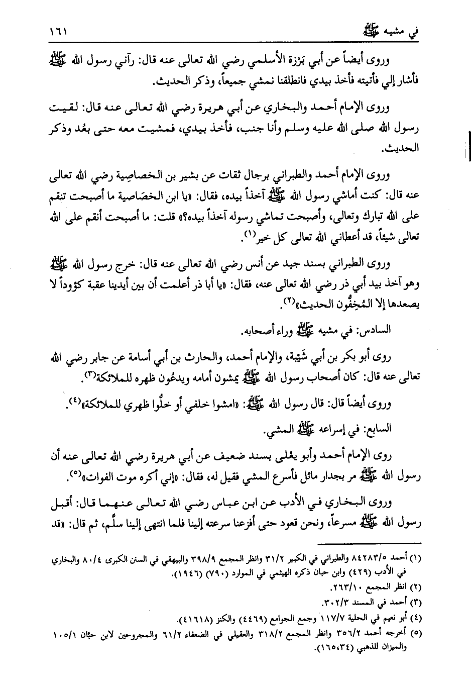 وروى الإمام أحمد والطبراني برجال ثقات عن بشير بن الخصاصية رضي الله تعالى عنه قال: كنت أماشي رسول الله صلى الله عليه وسلم آخذا بيده، فقال: «يا ابن الخصاصية ما أصبحت تنقم على الله تبارك وتعالى، وأصبحت تماشي رسوله آخذا بيده؟» قلت: ما أصبحت أنقم على الله تعالى شيئا، قد أعطاني الله تعالى كل خير [ (1) ] .