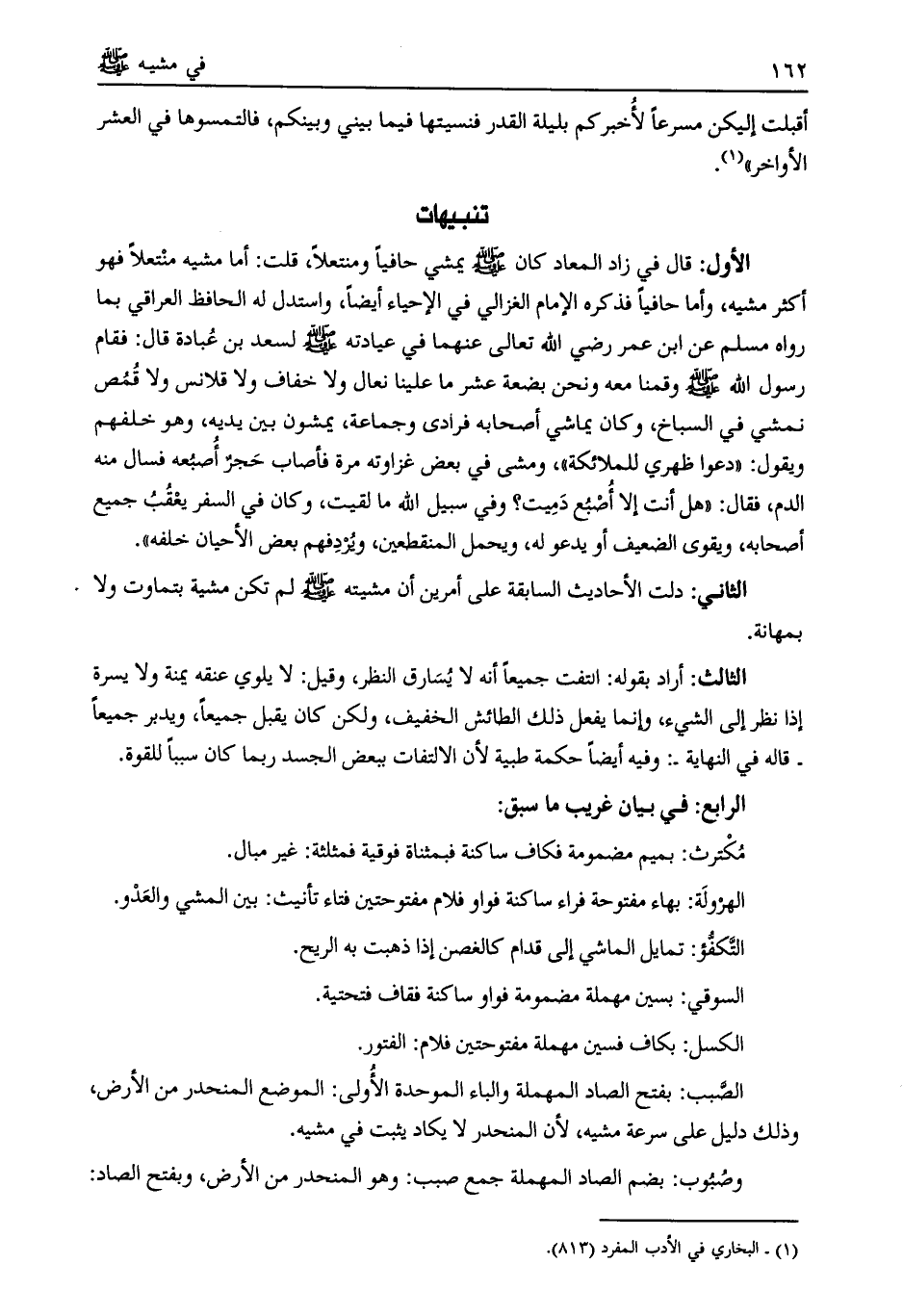 الأول: قال في زاد المعاد كان صلى الله عليه وسلم يمشي حافيا ومنتعلا، قلت: أما مشيه منتعلا فهو أكثر مشيه، وأما حافيا فذكره الإمام الغزالي في الإحياء أيضا، واستدل له الحافظ العراقي بما رواه مسلم عن ابن عمر رضي الله تعالى عنهما في عيادته صلى الله عليه وسلم لسعد بن عبادة قال: فقام رسول الله صلى الله عليه وسلّم وقمنا معه ونحن بضعة عشر ما علينا نعال ولا خفاف ولا قلانس ولا قمص نمشي في السباخ،