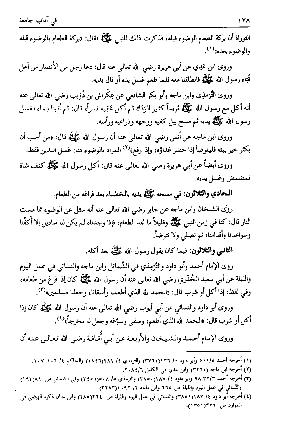 وروى ابن عدي عن أبي هريرة رضي الله تعالى عنه قال: دعا رجل من الأنصار من أهل قباء رسول الله صلى الله عليه وسلم فانطلقنا معه فلما طعم غسل يده أو قال يديه.