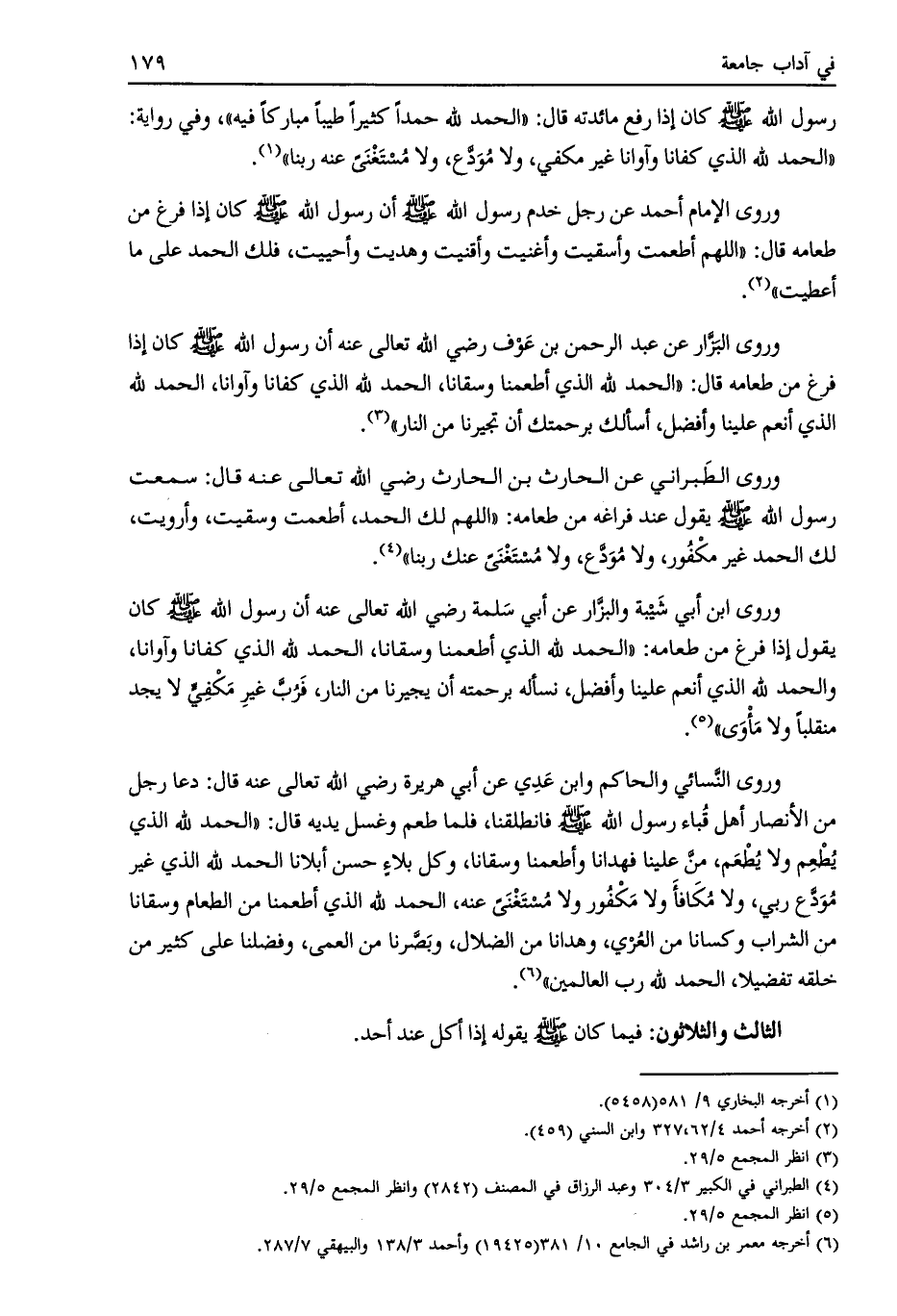 وروى ابن أبي شيبة والبزار عن أبي سلمة رضي الله تعالى عنه أن رسول الله صلى الله عليه وسلم كان يقول إذا فرغ من طعامه: «الحمد لله الذي أطعمنا وسقانا، الحمد لله الذي كفانا وآوانا، والحمد لله الذي أنعم علينا وأفضل، نسأله برحمته أن يجيرنا من النار، فربّ غير مكفيّ لا يجد منقلبا ولا مأوى» [ (5) ] .