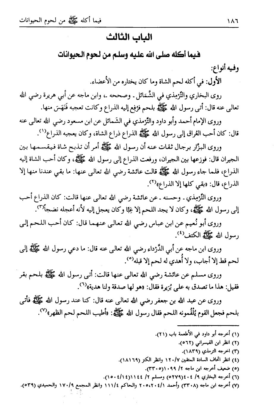 وروى الإمام أحمد وأبو داود والترمذي في الشمائل عن ابن مسعود رضي الله تعالى عنه قال: كان أحب العراق إلى رسول الله صلى الله عليه وسلّم الذراع ذراع الشاة، وكان يعجبه الذراع [ (1) ] .