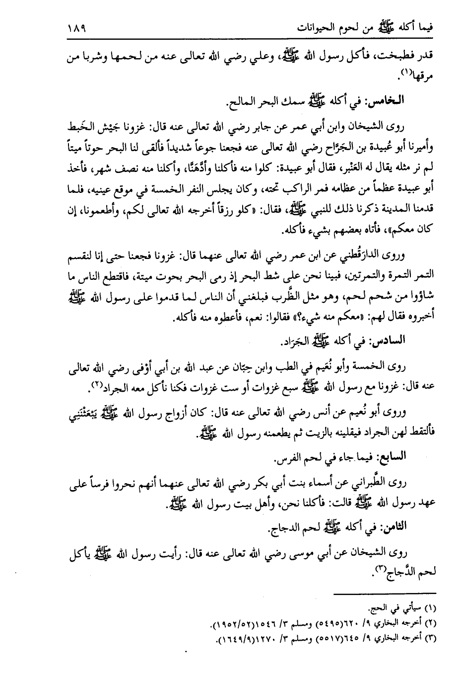 روى الخمسة وأبو نعيم في الطب وابن حبان عن عبد الله بن أبي أوفى رضي الله تعالى عنه قال: غزونا مع رسول الله صلى الله عليه وسلّم سبع غزوات أو ست غزوات فكنا نأكل معه الجراد [ (2) ] .