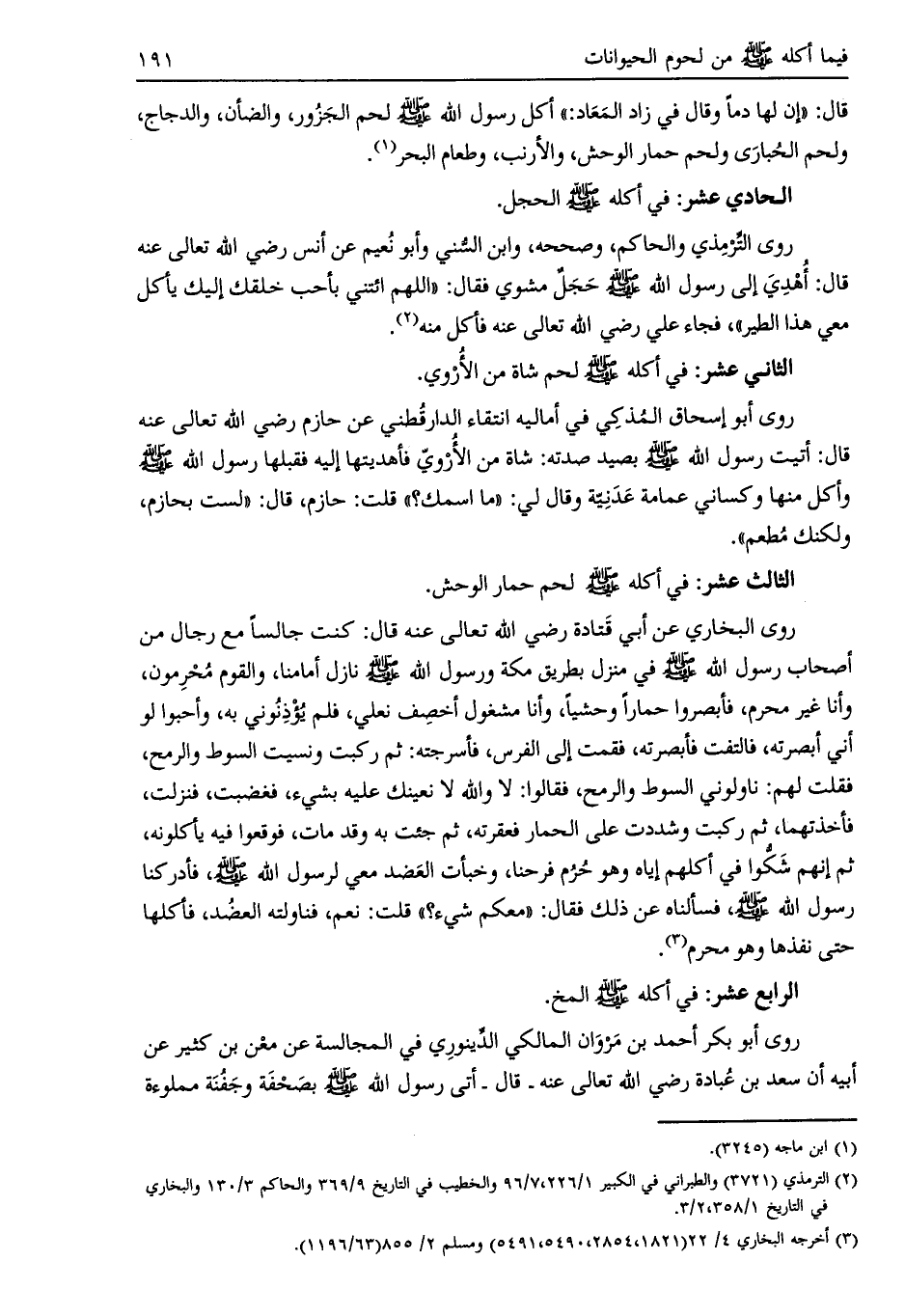 وقال في زاد المعاد:» أكل رسول الله صلى الله عليه وسلّم لحم الجزور، والضأن، والدجاج، ولحم الحبارى ولحم حمار الوحش، والأرنب، وطعام البحر [ (1) ] .