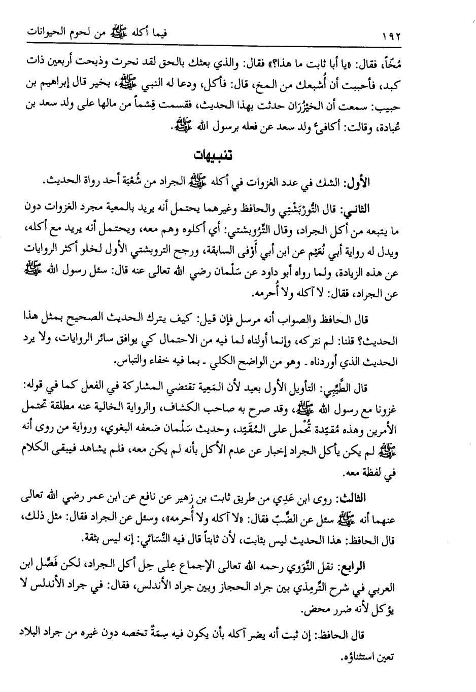 الرابع: نقل النووي رحمه الله تعالى الإجماع على حل أكل الجراد، لكن فصّل ابن العربي في شرح التّرمذي بين جراد الحجاز وبين جراد الأندلس، فقال: في جراد الأندلس لا يؤكل لأنه ضرر محض.