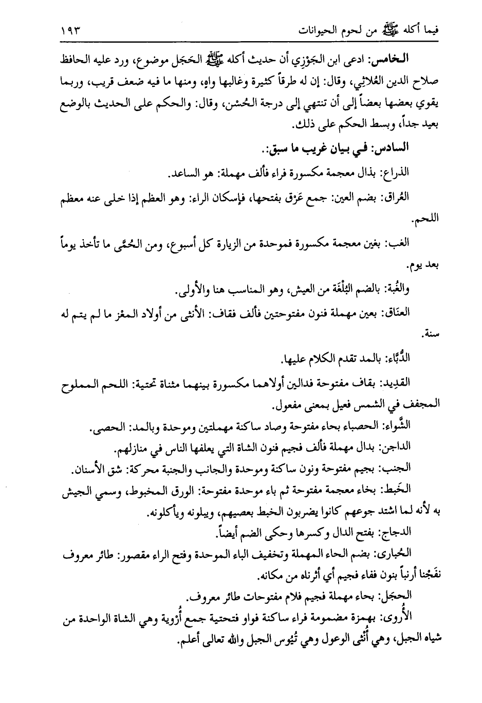 الخامس: ادعى ابن الجوزي أن حديث أكله صلّى الله عليه وسلّم الحجل موضوع، ورد عليه الحافظ صلاح الدين العلاثي، وقال: إن له طرقا كثيرة وغالبها واه، ومنها ما فيه ضعف قريب، وربما يقوي بعضها بعضا إلى أن تنتهي إلى درجة الحسن، وقال: والحكم على الحديث بالوضع بعيد جدا، وبسط الحكم على ذلك.