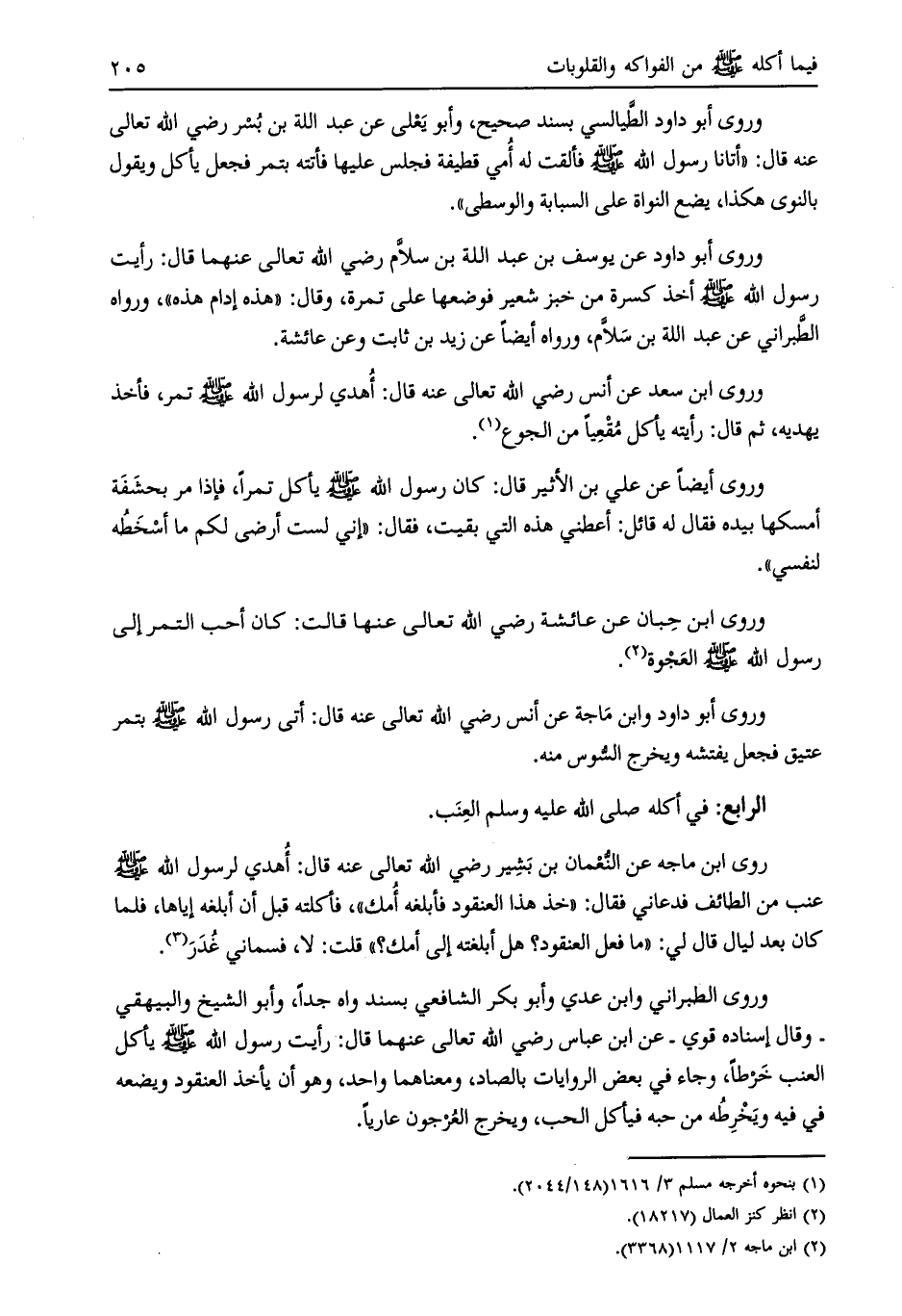 وروى أبو داود عن يوسف بن عبد الله بن سلام رضي الله تعالى عنهما قال: رأيت رسول الله صلى الله عليه وسلم أخذ كسرة من خبز شعير فوضعها على تمرة، وقال: «هذه إدام هذه» ، ورواه الطبراني عن عبد الله بن سلام، ورواه أيضاً عن زيد بن ثابت وعن عائشة.