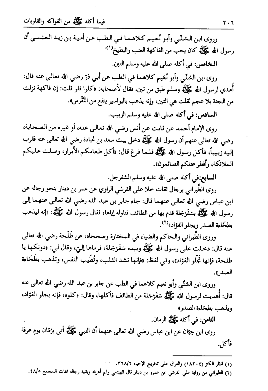 روى الطبراني برجال ثقات خلا على القرشي الراوي عن عمر بن دينار بنحو رجاله عن ابن عباس رضي الله تعالى عنهما قال: جاء جابر بن عبد الله رضي الله تعالى عنهما إلى رسول الله صلى الله عليه وسلّم بسفرجلة قدم بها من الطائف فناوله إياها، فقال رسول الله صلى الله عليه وسلّم: «إنه ليذهب بطخاءة الصدر ويجلو الفؤاد» [ (2) ] .