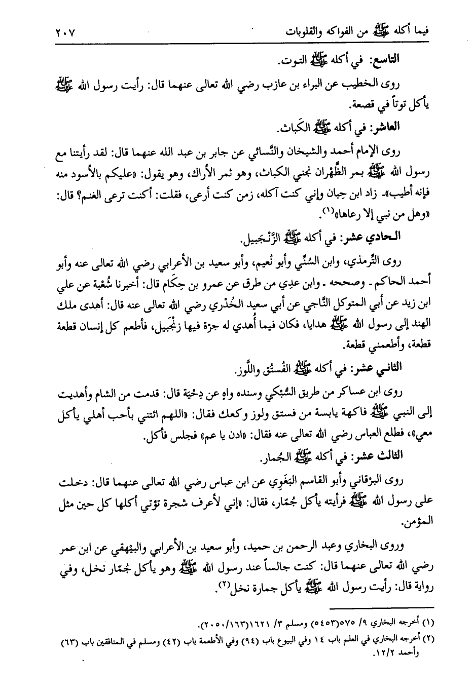 وروى البخاري وعبد الرحمن بن حميد، وأبو سعيد بن الأعرابي والبيهقي عن ابن عمر رضي الله تعالى عنهما قال: كنت جالسا عند رسول الله صلى الله عليه وسلم وهو يأكل جمّار نخل،
