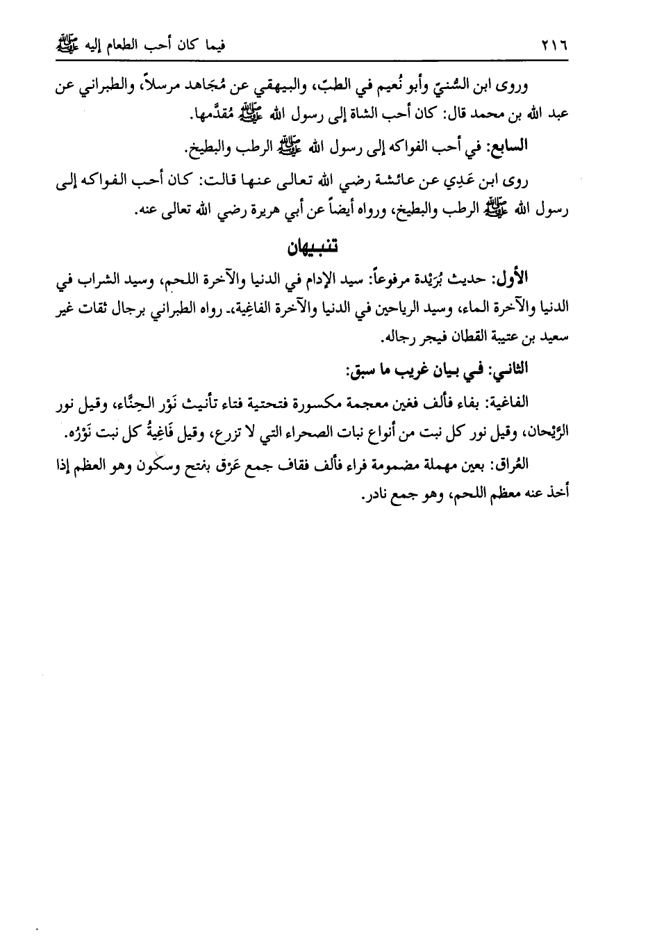 الأول: حديث بريدة مرفوعا: سيد الإدام في الدنيا والآخرة اللحم، وسيد الشراب في الدنيا والآخرة الماء، وسيد الرياحين في الدنيا والآخرة الفاغية، - رواه الطبراني برجال ثقات غير سعيد بن عتيبة القطان فيجر رجاله.