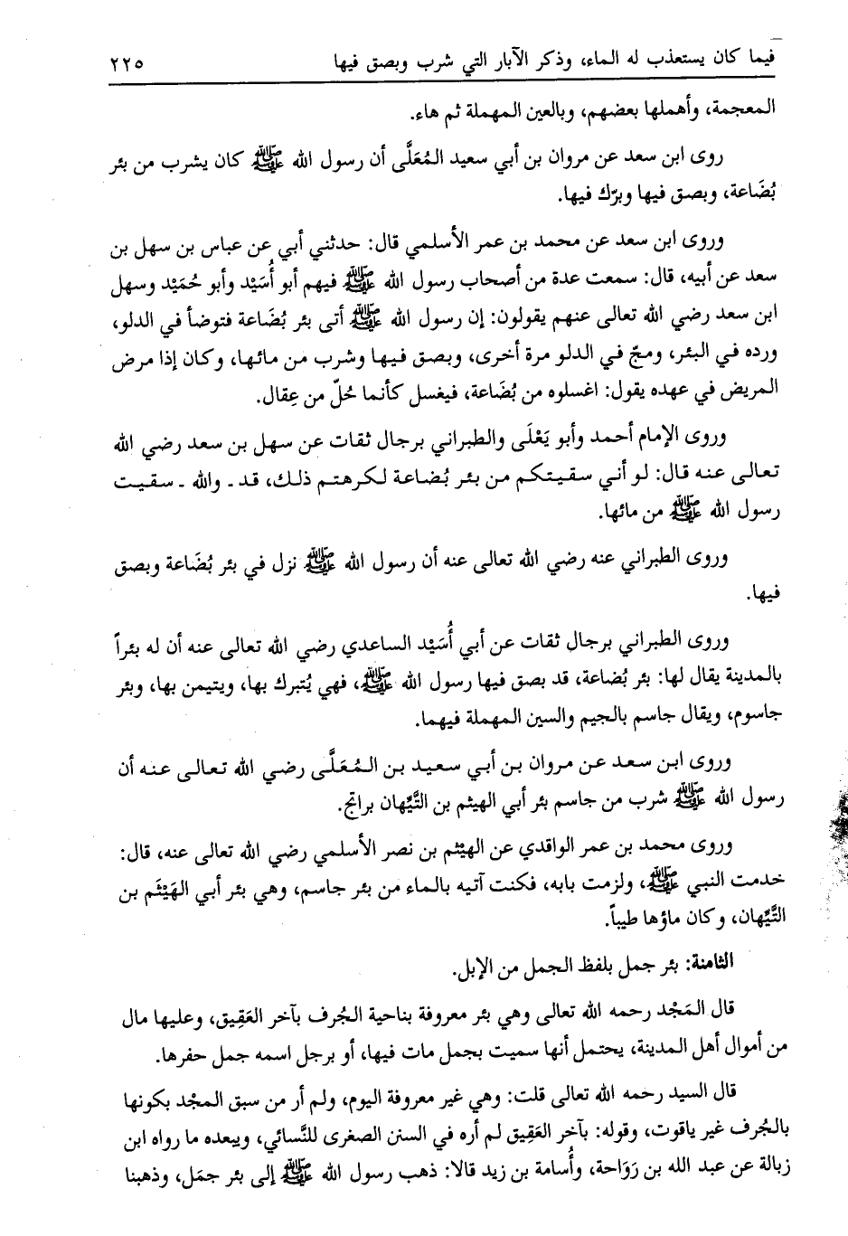 وروى الإمام أحمد وأبو يعلى والطبراني برجال ثقات عن سهل بن سعد رضي الله تعالى عنه قال: لو أني سقيتكم من بئر بضاعة لكرهتم ذلك، قد- والله- سقيت رسول الله صلى الله عليه وسلم من مائها.