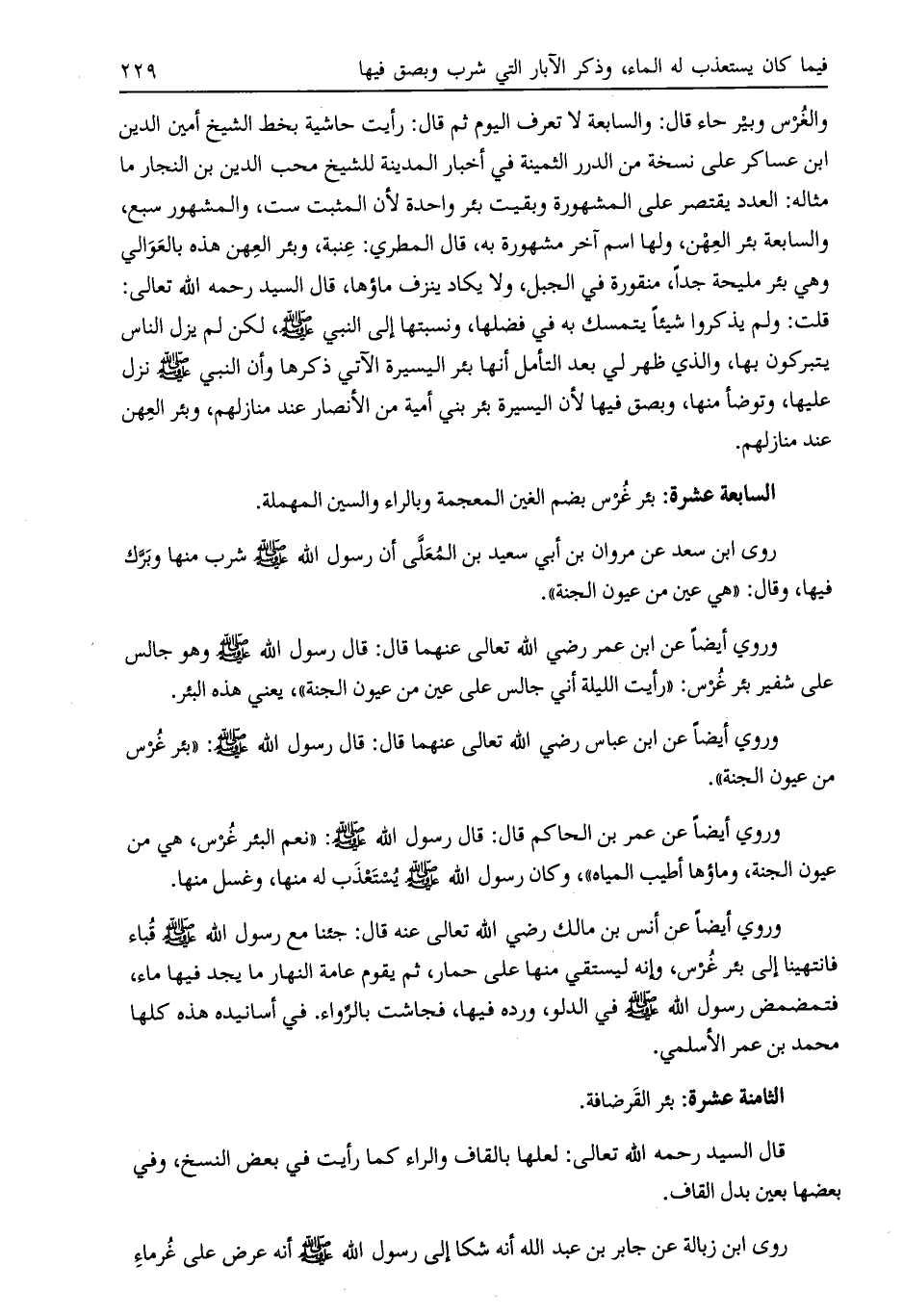 وروى أيضاً عن ابن عمر رضي الله تعالى عنهما قال: قال رسول الله صلى الله عليه وسلم وهو جالس على شفير بئر غرس: «رأيت الليلة أني جالس على عين من عيون الجنة» ، يعني هذه البئر.