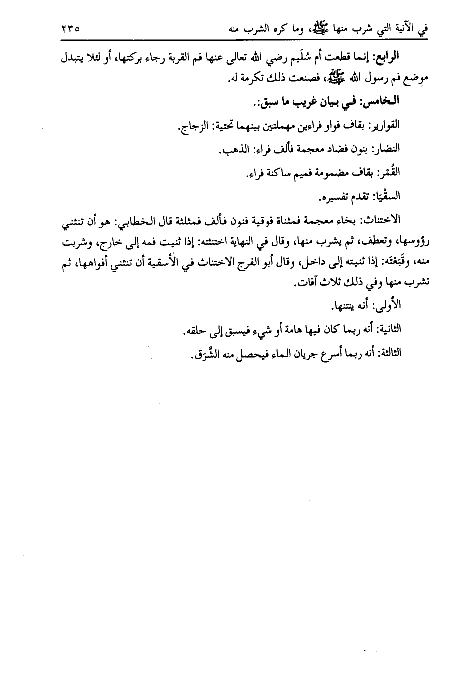 الرابع: إنما قطعت أم سليم رضي الله تعالى عنها فم القربة رجاء بركتها، أو لئلا يتبدل موضع فم رسول الله صلى الله عليه وسلم، فصنعت ذلك تكرمة له.
