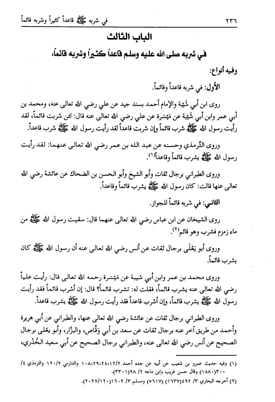 الباب الثالث في شربه صلى الله عليه وسلّم قاعدا كثيرا وشربه قائماً،