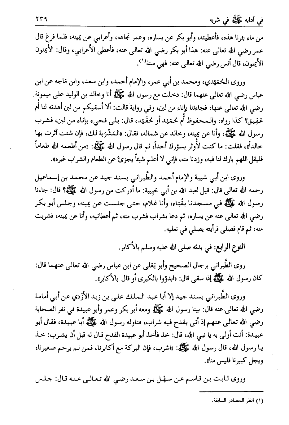 روى الطبراني برجال الصحيح وأبو يعلى عن ابن عباس رضي الله تعالى عنهما قال: كان رسول الله صلى الله عليه وسلم إذا سقى قال: «ابدؤوا بالكبرى أو قال بالأكابر» .