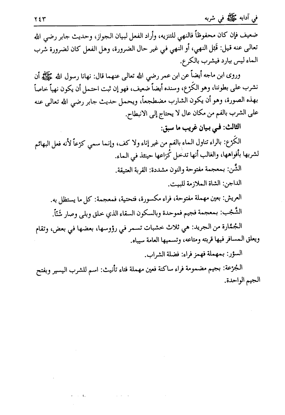 وروى ابن ماجه أيضا عن ابن عمر رضي الله تعالى عنهما قال: نهانا رسول الله صلى الله عليه وسلم أن نشرب على بطوننا، وهو الكرع، وسنده أيضا ضعيف، فهو إن ثبت احتمل أن يكون نهيا خاصا بهذه الصورة، وهو أن يكون الشارب مضطجعا، ويحمل حديث جابر رضي الله تعالى عنه على الشرب بالفم من مكان عال لا يحتاج إلى الانبطاح.