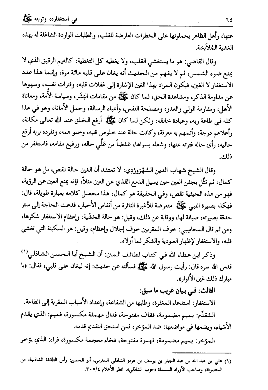 وذكر ابن عطاء الله في كتاب لطائف المنن: أن الشيخ أبا الحسن الشاذلي [ (1) ] قدس الله سره قال: رأيت رسول الله صلى الله عليه وسلّم فسألته عن حديث: إنه ليغان على قلبي، فقال: «يا مبارك ذلك غين الأنوار» .