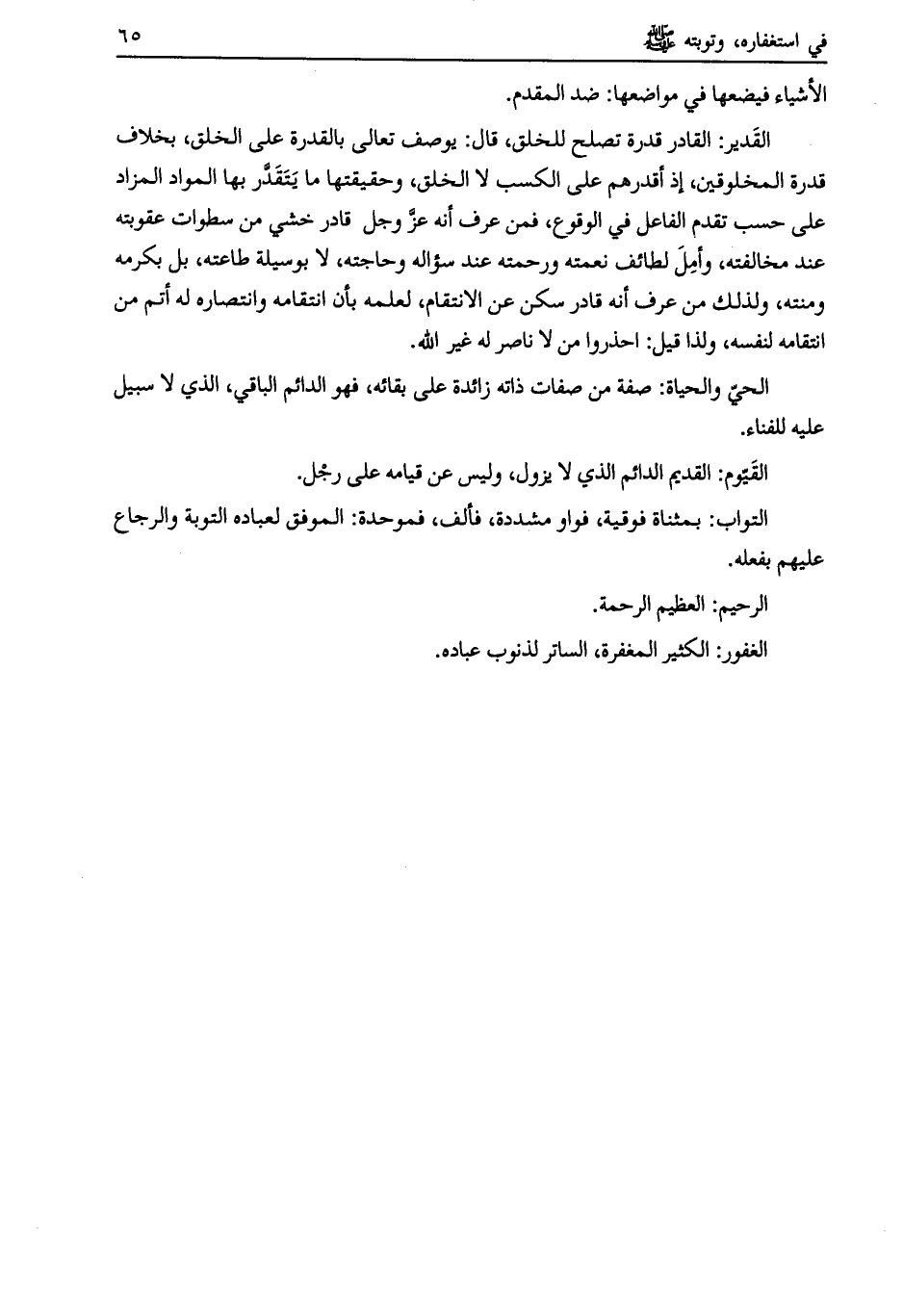 القدير: القادر قدرة تصلح للخلق، قال: يوصف تعالى بالقدرة على الخلق، بخلاف قدرة المخلوقين، إذ أقدرهم على الكسب لا الخلق، وحقيقتها ما يتقدّر بها المواد المزاد على حسب تقدم الفاعل في الوقوع، فمن عرف أنه عز وجل قادر خشي من سطوات عقوبته عند مخالفته، وأمل لطائف نعمته ورحمته عند سؤاله وحاجته، لا بوسيلة طاعته، بل بكرمه ومنته، ولذلك من عرف أنه قادر سكن عن الانتقام، لعلمه بأن انتقامه وانتصاره له أتم من انتقامه لنفسه، ولذا قيل: احذروا من لا ناصر له غير الله.