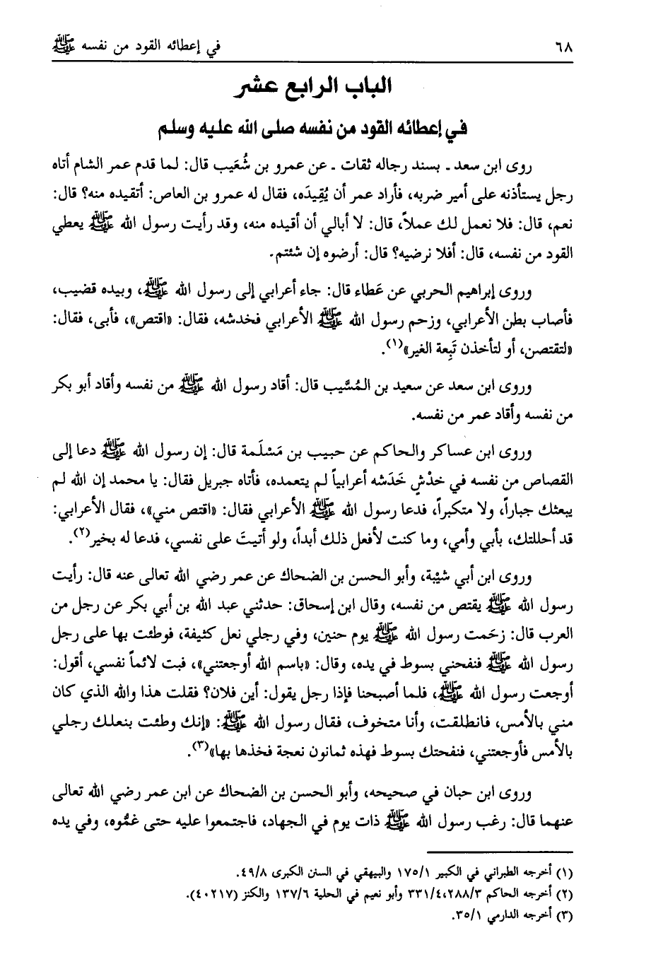 وروى ابن أبي شيبة، وأبو الحسن بن الضحاك عن عمر رضي الله تعالى عنه قال: رأيت رسول الله صلى الله عليه وسلّم يقتص من نفسه،