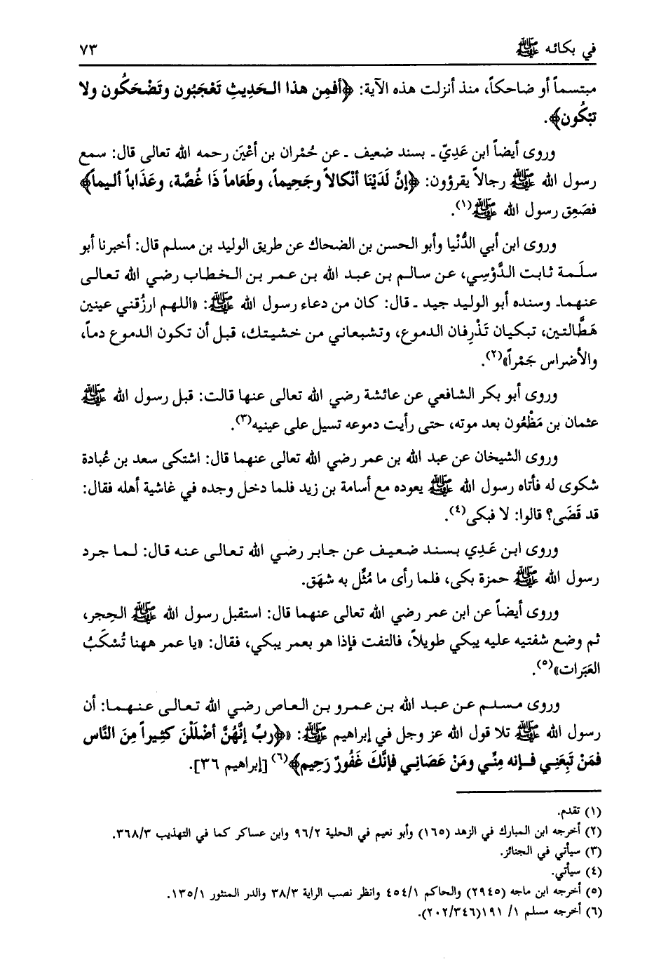 وروى مسلم عن عبد الله بن عمرو بن العاص رضي الله تعالى عنهما: أن رسول الله صلى الله عليه وسلم تلا قول الله عز وجل في إبراهيم صلى الله عليه وسلّم: «رَبِّ إِنَّهُنَّ أَضْلَلْنَ كَثِيراً مِنَ النَّاسِ فَمَنْ تَبِعَنِي فَإِنَّهُ مِنِّي وَمَنْ عَصانِي فَإِنَّكَ غَفُورٌ رَحِيمٌ [ (6) ] [إبراهيم 36] .