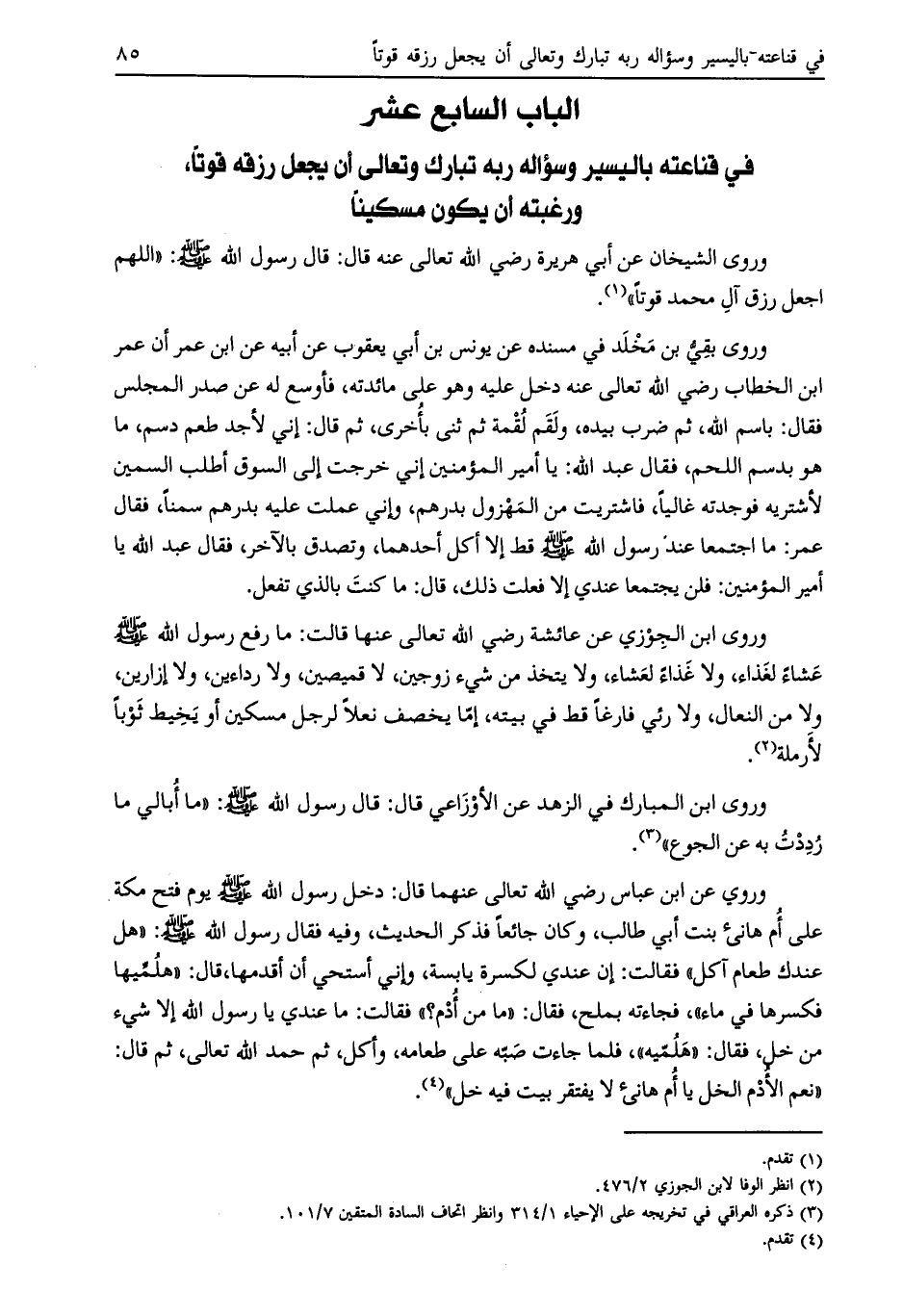 الباب السابع عشر في قناعته باليسير وسؤاله ربه تبارك وتعالى أن يجعل رزقه قوتا، ورغبته أن يكون مسكينا