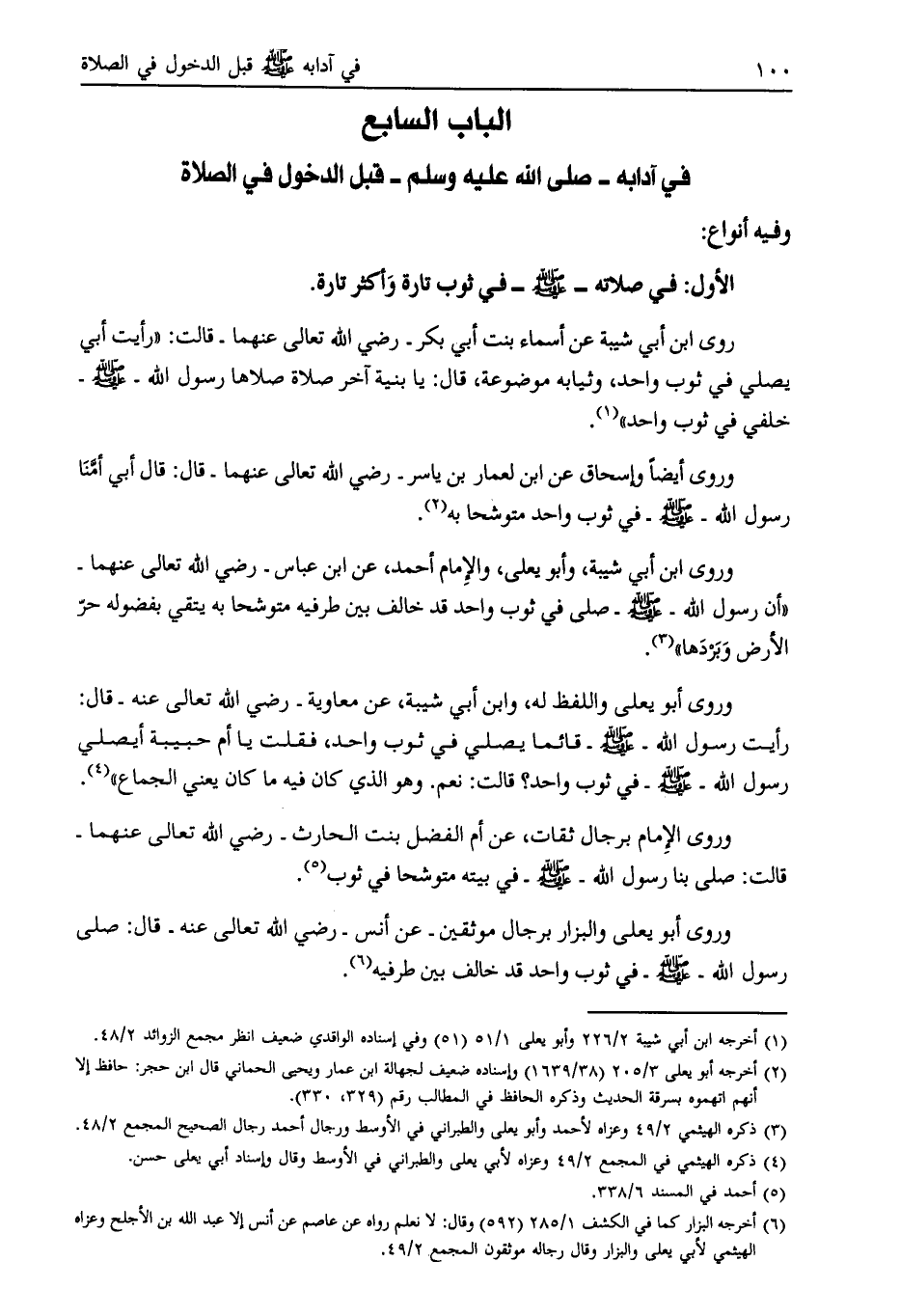 وروى ابن أبي شيبة، وأبو يعلى، والإمام أحمد، عن ابن عباس- رضي الله تعالى عنهما- «أن رسول الله- صلى الله عليه وسلم- صلى في ثوب واحد قد خالف بين طرفيه متوشحا به يتقي بفضوله حرّ الأرض وبردها» [ (3) ] .