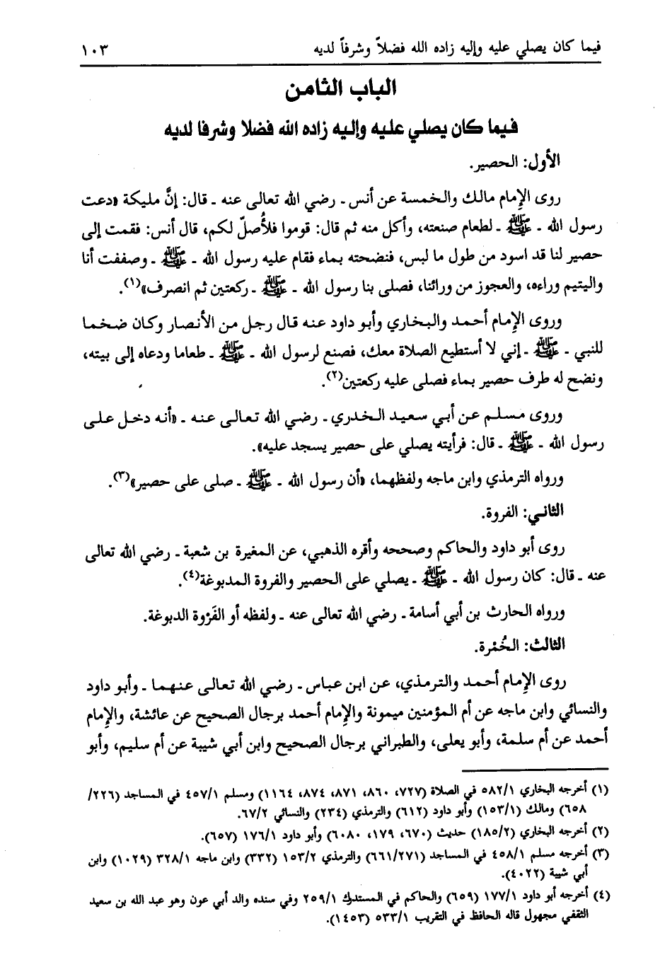 روى أبو داود والحاكم وصححه واقره الذهبي، عن المغيرة بن شعبة- رضي الله تعالى عنه- قال: كان رسول الله- صلى الله عليه وسلّم- يصلي على الحصير والفروة المدبوغة [ (4) ] .