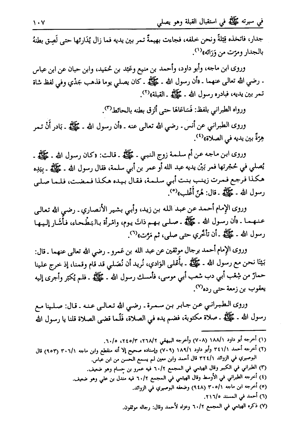 وروى ابن ماجه، وأبو داود، وأحمد بن منيع وعبد بن حميد، وابن حبان عن ابن عباس- رضي الله تعالى عنهما- «أن رسول الله- صلى الله عليه وسلم- كان يصلي يوما فذهب جدي وفي لفظ شاة تمر بين يديه، فبادره رسول الله- صلى الله عليه وسلم- القبلة» [ (2) ] .