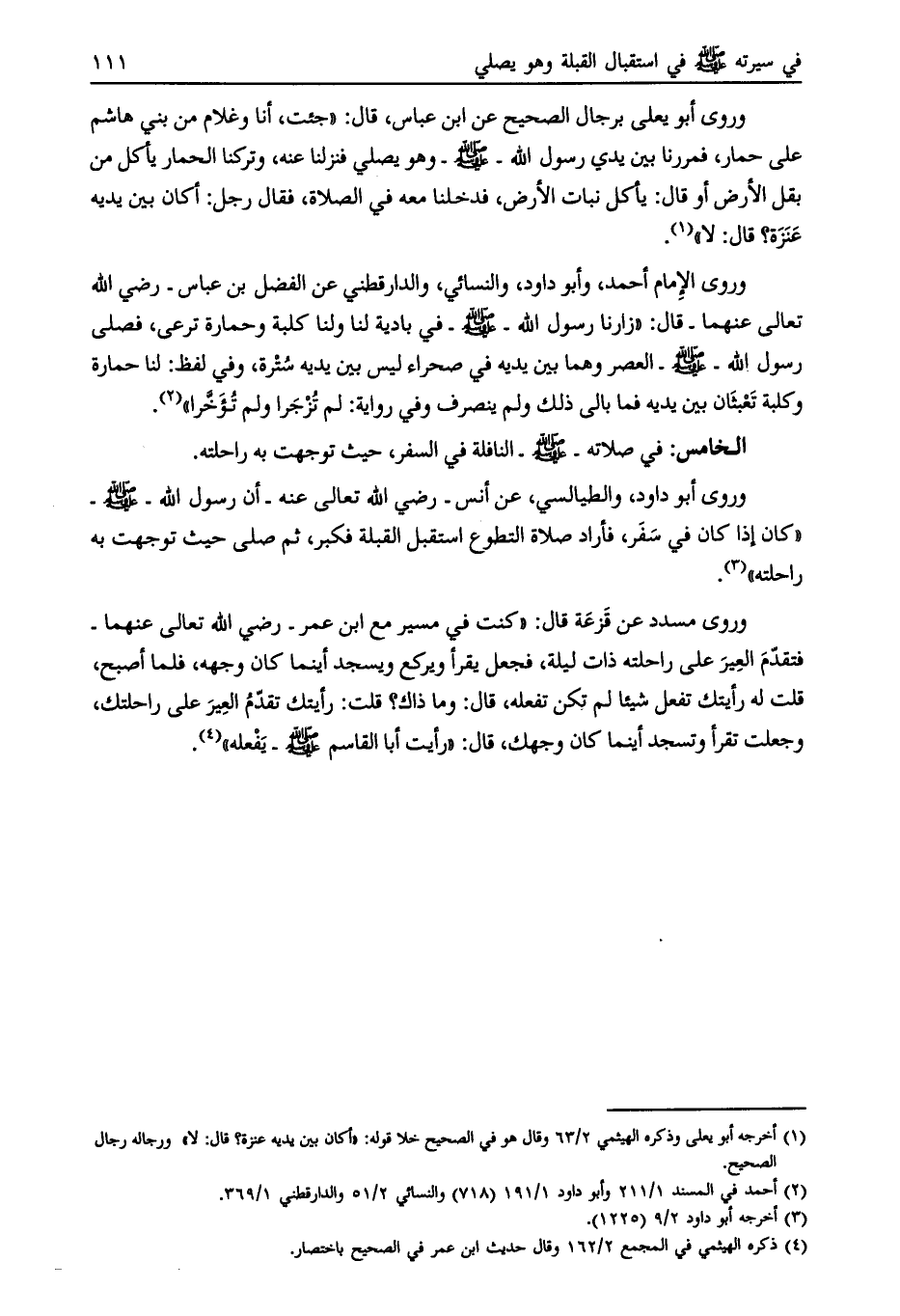 وروى الإمام أحمد، وأبو داود، والنسائي، والدارقطني عن الفضل بن عباس- رضي الله تعالى عنهما- قال: «زارنا رسول الله- صلى الله عليه وسلم- في بادية لنا ولنا كلبة وحمارة ترعى، فصلى رسول الله- صلى الله عليه وسلّم- العصر وهما بين يديه في صحراء ليس بين يديه سترة، وفي لفظ: لنا حمارة وكلبة تعبثان بين يديه فما بالي ذلك ولم ينصرف وفي رواية: لم تزجرا ولم تؤخّرا» [ (2) ] .