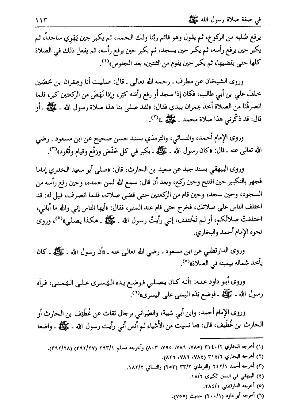 وروى الشيخان عن مطرف- رحمه الله تعالى- قال: صليت أنا وعمران بن حصين خلف علي بن أبي طالب، فكان إذا سجد أو رفع رأسه كبّر، وإذا نهض من الركعتين كبر، فلما انصرفنا من الصلاة أخذ عمران بيدي فقال: «لقد صلى بنا هذا صلاة رسول الله- صلى الله عليه وسلم- أو قال: قد ذكّرني هذا صلاة محمد- صلى الله عليه وسلم-» [ (2) ] .