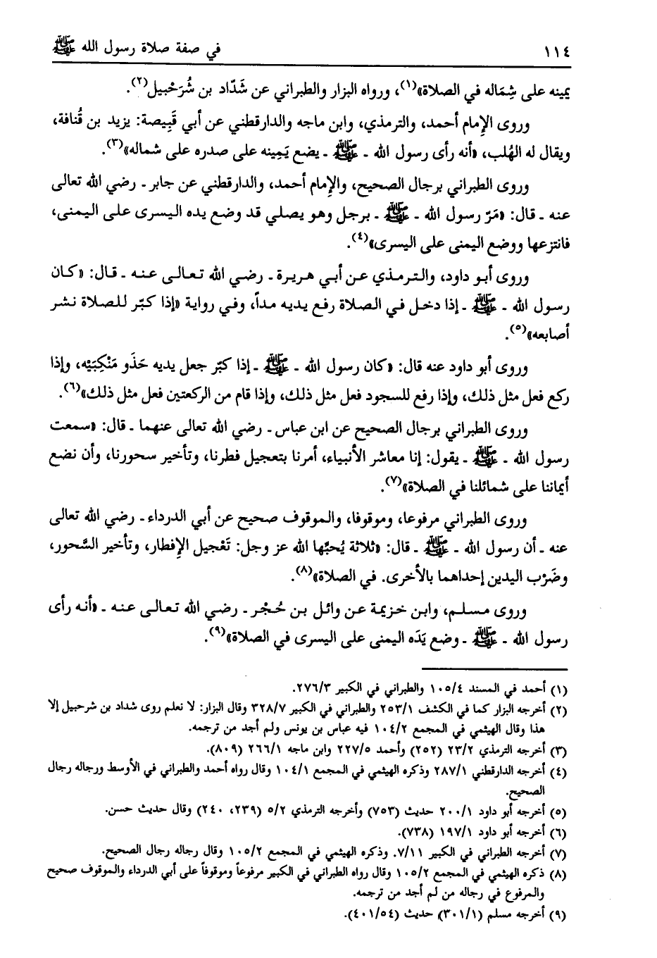 وروى الإمام أحمد، والترمذي، وابن ماجة والدارقطني عن أبي قبيصة: يزيد بن قنافة، ويقال له الهلب، «أنه رأى رسول الله- صلى الله عليه وسلّم- يضع يمينه على صدره على شماله» [ (3) ] .