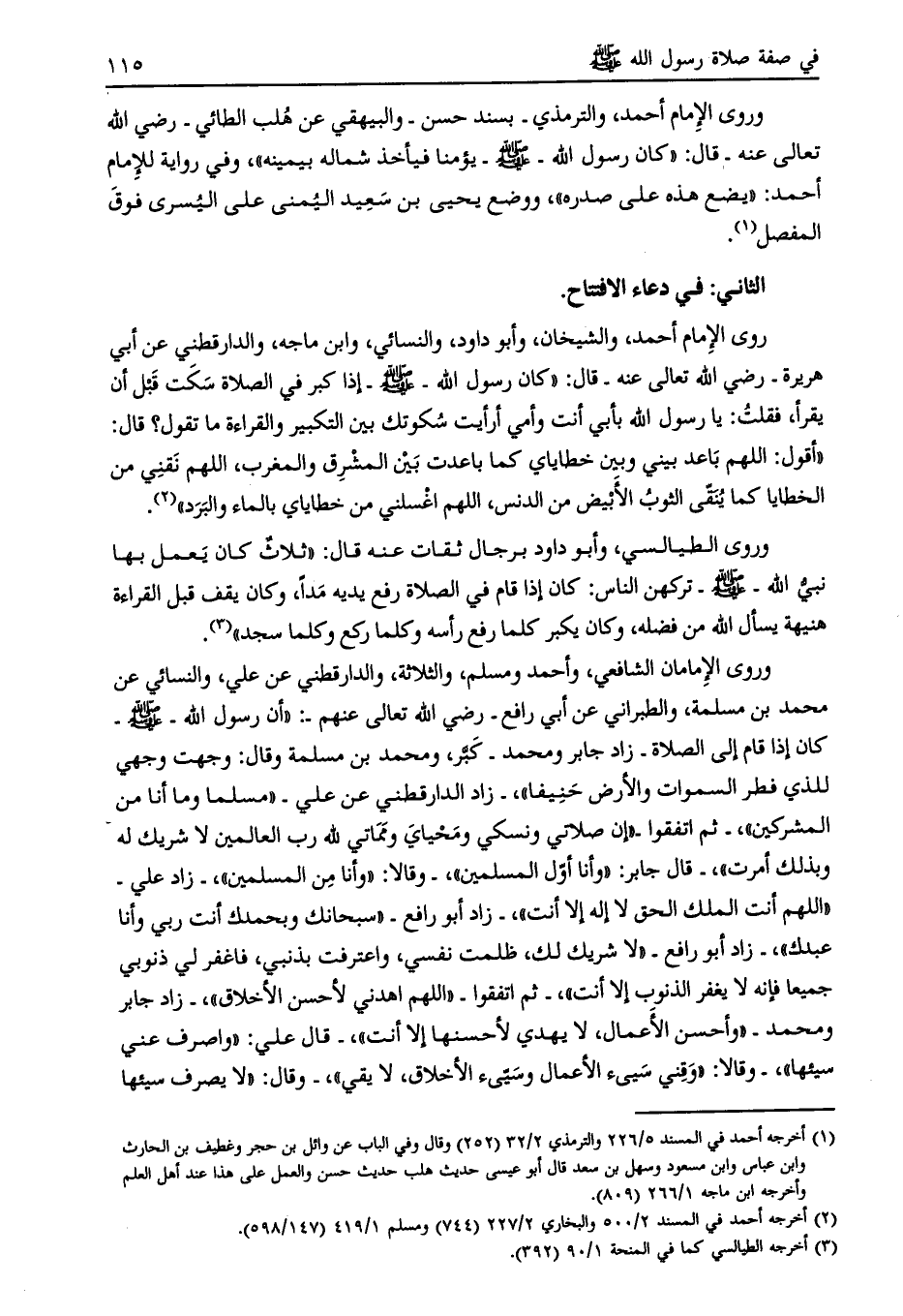 وروى الإمامان الشافعي، وأحمد ومسلم، والثلاثة، والدارقطني عن علي، والنسائي عن محمد بن مسلمة، والطبراني عن أبي رافع- رضي الله تعالى عنهم-: «أن رسول الله- صلى الله عليه وسلم- كان إذا قام إلى الصلاة- زاد جابر ومحمد- كبّر، ومحمد بن مسلمة وقال: وجهت وجهي للذي فطر السموات والأرض حنيفا» ، - زاد الدارقطني عن علي- «مسلما وما أنا من المشركين» ، - ثم اتفقوا- «إن صلاتي ونسكي ومحياي ومماتي لله رب العالمين لا شريك له وبذلك أمرت» ، قال جابر: «وأنا أوّل المسلمين» ، - وقالا: «وأنا من المسلمين» ، - زاد علي- «اللهم أنت الملك الحق لا إله إلا أنت» ، - زاد أبو رافع- «سبحانك وبحمدك أنت ربي وأنا عبدك» ، - زاد أبو رافع- «لا شريك لك، ظلمت نفسي، واعترفت بذنبي، فاغفر لي ذنوبي جميعا فإنه لا يغفر الذنوب إلا أنت» ، - ثم اتفقوا- «اللهم اهدني لأحسن الأخلاق» ، - زاد جابر ومحمد- «وأحسن الأعمال، لا يهدي لأحسنها إلا أنت» ، - قال علي: «واصرف عني سيئها» ، - وقالا: «وقني سيىء الأعمال وسيّء الأخلاق، لا يقي» ، - وقال: «لا يصرف سيئها