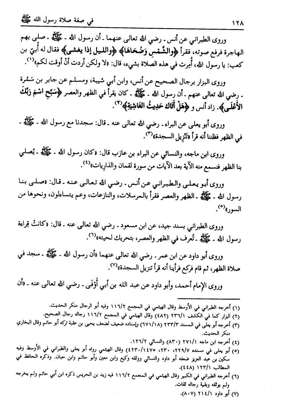 وروى أبو يعلى والطبراني عن أنس- رضي الله تعالى عنه- قال: «صلى بنا رسول الله- صلى الله عليه وسلّم- الظهر والعصر فقرأ بالمرسلات، والنازعات، وعم يتساءلون، ونحوها من السور» [ (5) ] .