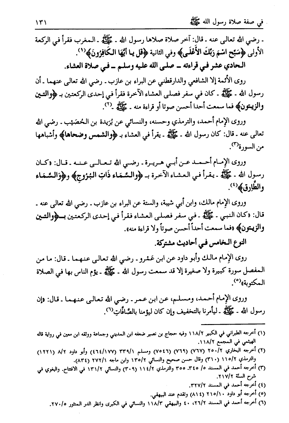 وروى الإمام مالك، وابن أبي شيبة، والستة عن البراء بن عازب- رضي الله تعالى عنه- قال: «كان النبي- صلى الله عليه وسلم- في سفر فصلى العشاء فقرأ في إحدى الركعتين ب وَالتِّينِ وَالزَّيْتُونِ «فما سمعت أحدا أحسن صوتا ولا قراءة منه» .