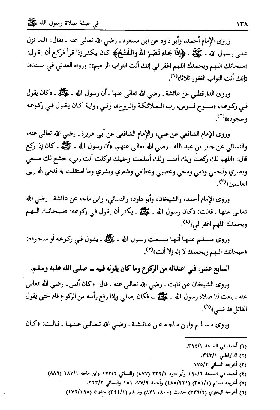وروى الإمام أحمد، وأبو داود عن ابن مسعود- رضي الله تعالى عنه- فقال: «لما نزل على رسول الله- صلى الله عليه وسلّم- إِذا جاءَ نَصْرُ اللَّهِ وَالْفَتْحُ كان يكثر إذا قرأ فركع أن يقول: