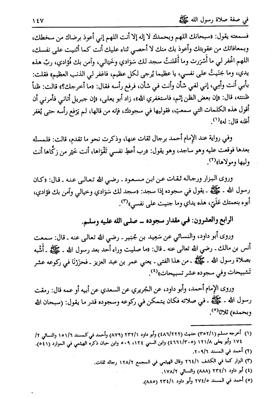 وروى البزّار ورجاله ثقات عن ابن مسعود- رضي الله تعالى عنه- قال: «كان رسول الله- صلى الله عليه وسلم- يقول في سجوده إذا سجد: «سجد لك سوادي وخيالي وآمن بك فؤادي، أبوء بنعمتك عليّ، هذه يداي وما جنيت على نفسي» [ (3) ] .