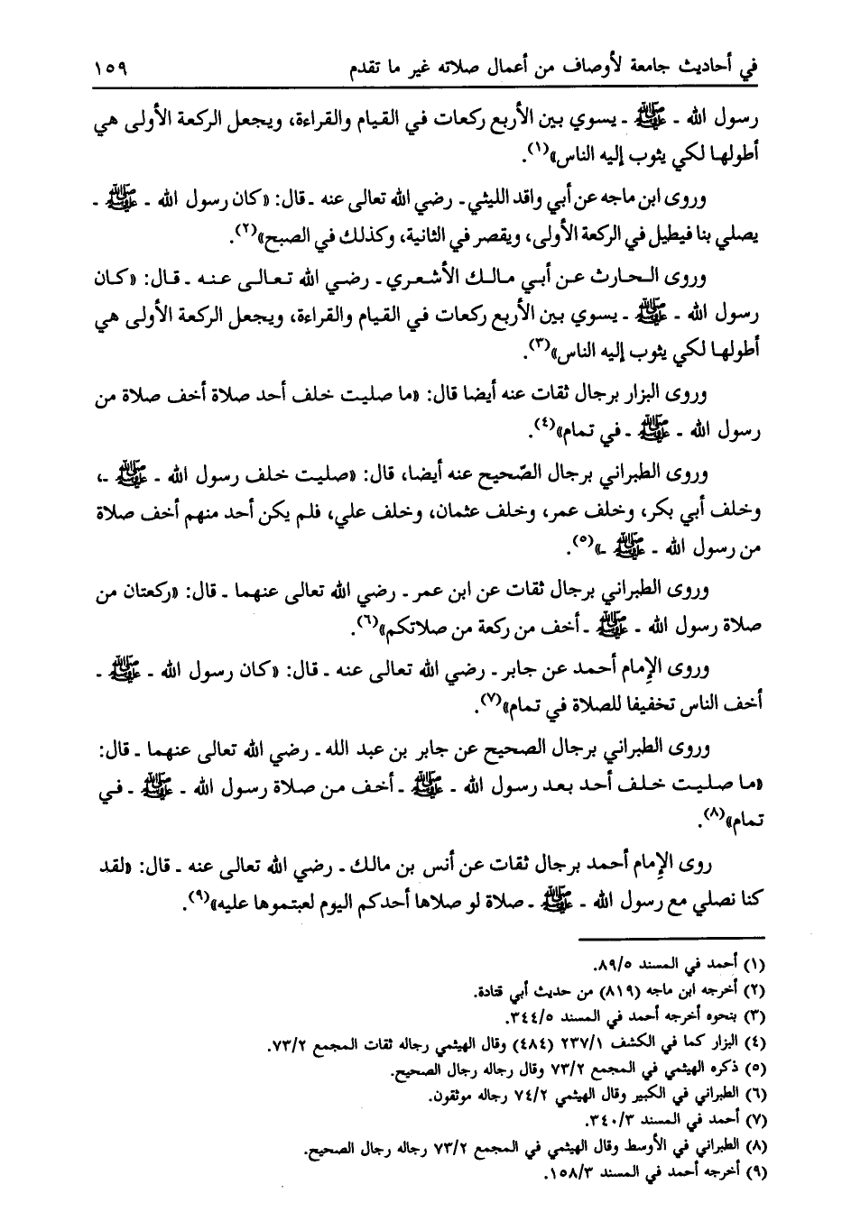 وروى البزار برجال ثقات عنه أيضاً قال: «ما صليت خلف أحد صلاة أخف صلاة من رسول الله- صلى الله عليه وسلّم- في تمام» [ (4) ] .