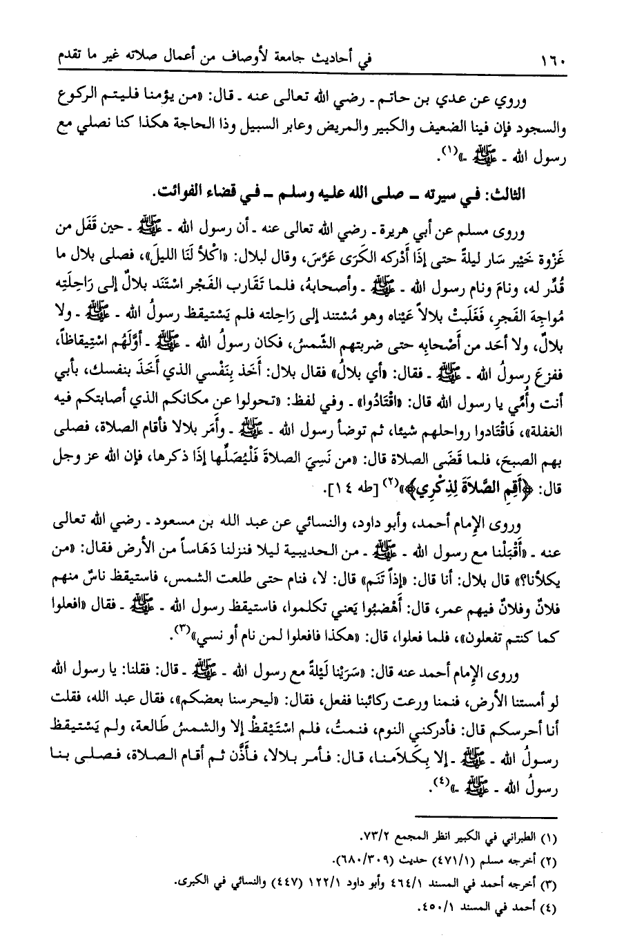 وروى الإمام أحمد، وأبو داود، والنسائي عن عبد الله بن مسعود- رضي الله تعالى عنه- «أقبلنا مع رسول الله- صلى الله عليه وسلّم- من الحديبية ليلا فنزلنا دهاسا من الأرض فقال: «من يكلأنا؟» قال بلال: أنا قال: «إذا تنم» قال: لا، فنام حتى طلعت الشمس، فاستيقظ ناس منهم فلان وفلان فيهم عمر، قال: أهضبوا يعني تكلموا، فاستيقظ رسول الله- صلى الله عليه وسلم- فقال «افعلوا كما كنتم تفعلون» ، فلما فعلوا، قال: «هكذا فافعلوا لمن نام أو نسي» [ (3) ] .