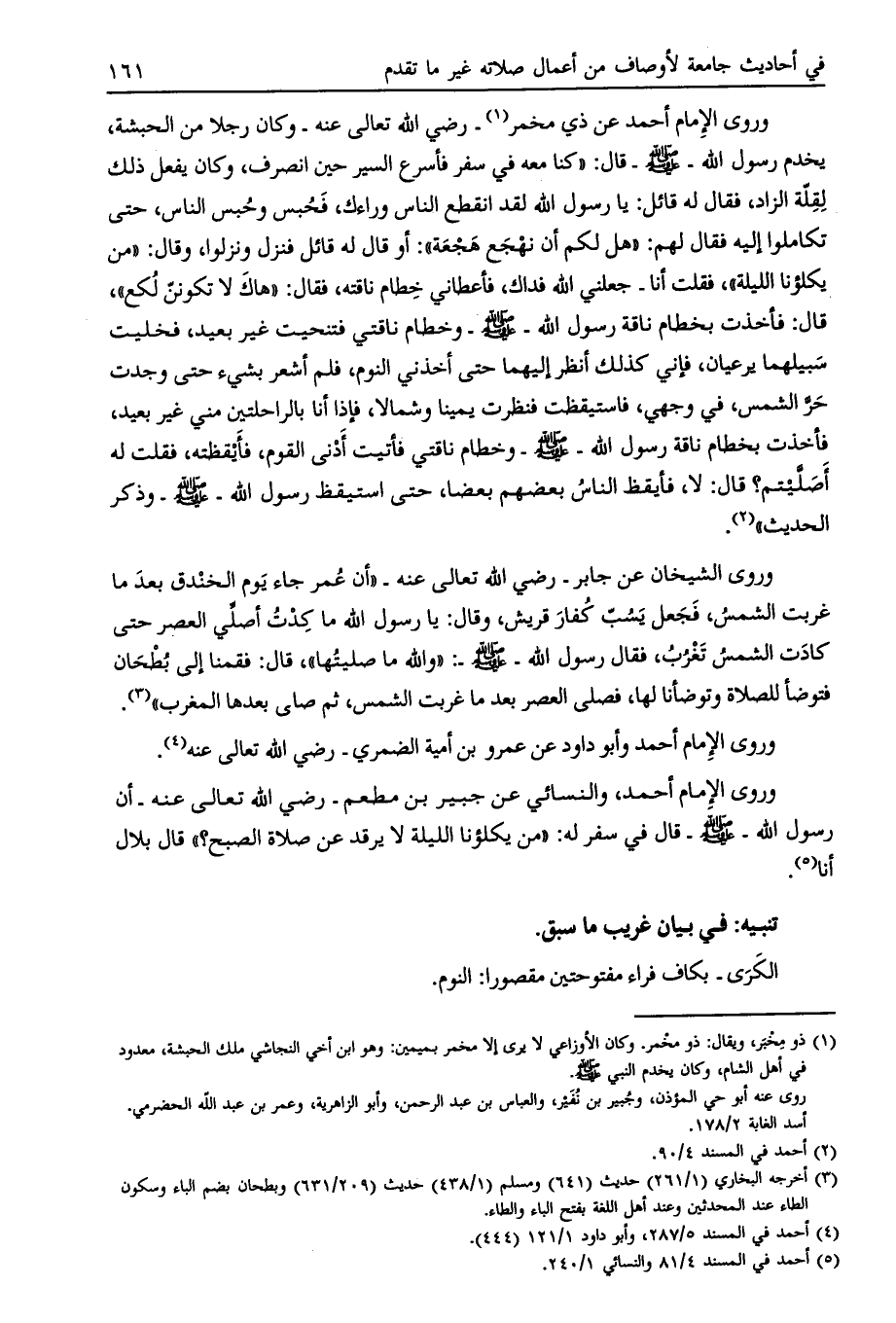 وروى الإمام أحمد عن ذي مخمر [ (1) ]- رضي الله تعالى عنه- وكان رجلاً من الحبشة، يخدم رسول الله- صلى الله عليه وسلم- قال: «كنا معه في سفر فأسرع السير حين انصرف، وكان يفعل ذلك لقلّة الزاد، فقال له قائل: يا رسول الله لقد انقطع الناس وراءك، فحبس وحبس الناس، حتى تكاملوا إليه فقال لهم: «هل لكم أن نهجع هجعة» : أو قال له قائل فنزل ونزلوا، وقال: «من يكلؤنا الليلة» ، فقلت أنا- جعلني الله فداك، فأعطاني خطام ناقته، فقال: «هاك لا تكوننّ لكع» ، قال: فأخذت بخطام ناقة رسول الله- صلى الله عليه وسلّم- وخطام ناقتي فتنحيت غير بعيد، فخليت سبيلهما يرعيان، فإني كذلك أنظر إليهما حتى أخذني النوم، فلم أشعر بشيء حتى وجدت حرّ الشمس، في وجهي، فاستيقظت فنظرت يمينا وشمالا، فإذا أنا بالراحلتين مني غير بعيد، فأخذت بخطام ناقة رسول الله- صلى الله عليه وسلّم- وخطام ناقتي فأتيت أدنى القوم، فأيقظته، فقلت له أصلّيتم؟ قال: لا، فأيقظ الناس بعضهم بعضا، حتى استيقظ رسول الله- صلى الله عليه وسلّم- وذكر الحديث» [ (2) ] .