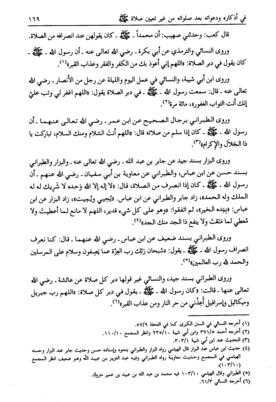 وروى الطبراني بسند جيد، والنسائي غير قولها دبر كل صلاة عن عائشة- رضي الله تعالى عنها- قالت: «كان رسول الله- صلى الله عليه وسلم- يقول في دبر كل صلاة: «اللهم رب جبريل وميكائيل وإسرافيل أعذني من حر النار ومن عذاب القبر» [ (6) ] .