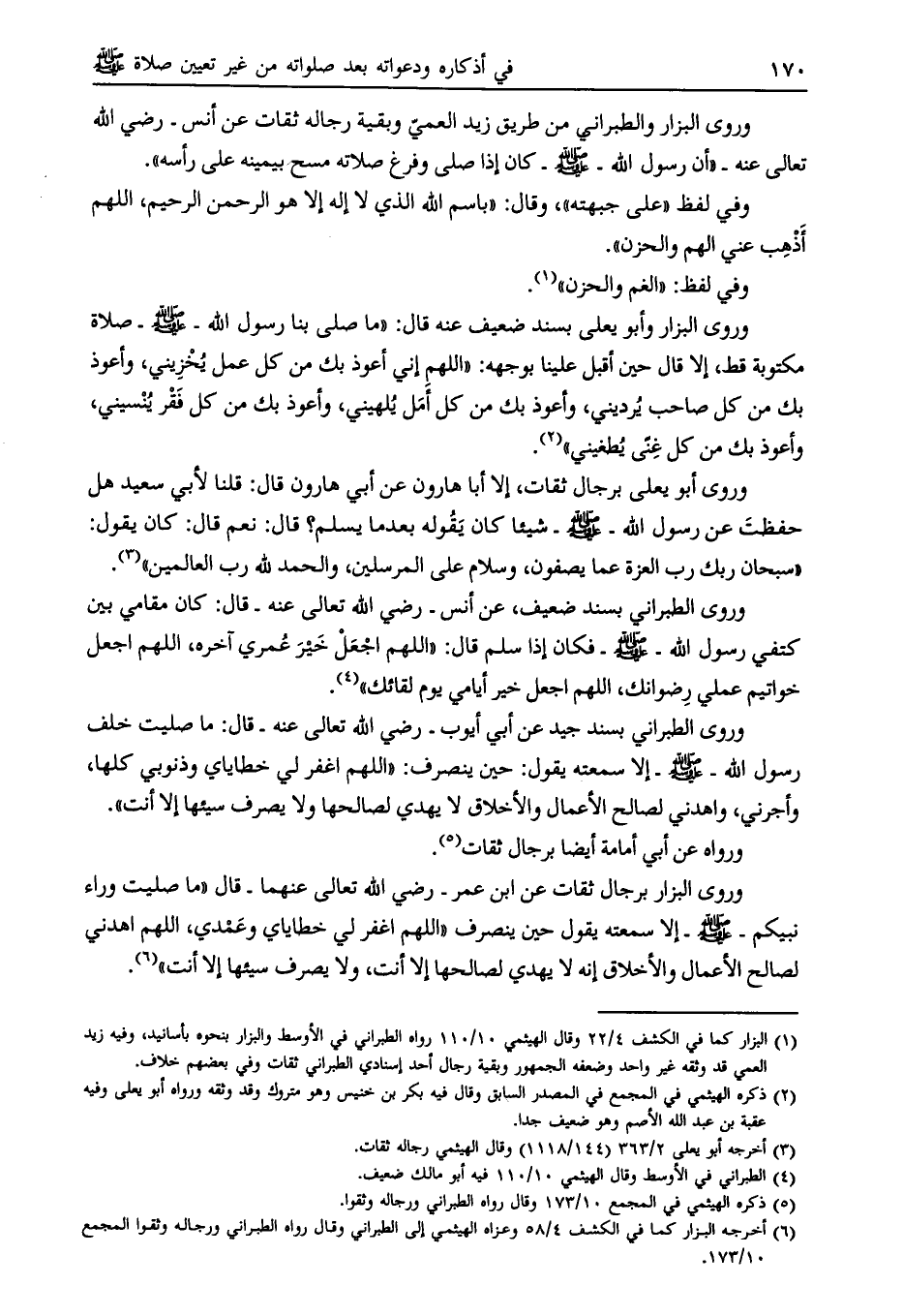 وروى البزار برجال ثقات عن ابن عمر- رضي الله تعالى عنهما- قال «ما صليت وراء نبيكم- صلى الله عليه وسلّم- إلا سمعته يقول حين ينصرف «اللهم اغفر لي خطاياي وعمدي، اللهم اهدني لصالح الأعمال والأخلاق إنه لا يهدي لصالحها إلا أنت، ولا يصرف سيئها إلا أنت» [ (6) ] .