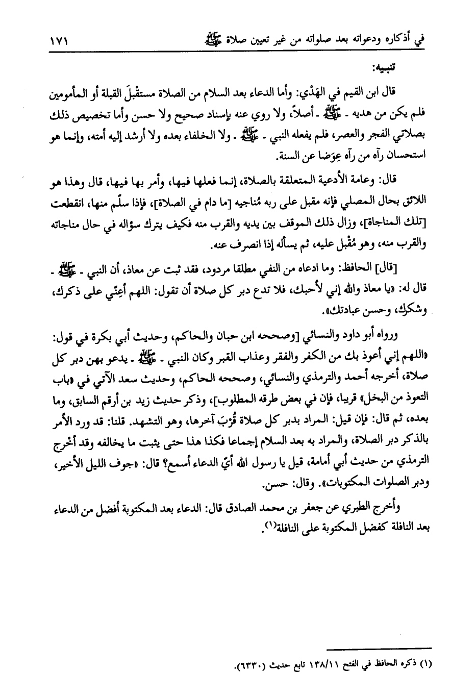 قال ابن القيم في الهدي: وأما الدعاء بعد السلام من الصلاة مستقبل القبلة أو المأمومين فلم يكن من هديه- صلى الله عليه وسلّم- أصلا، ولا روي عنه بإسناد صحيح ولا حسن وأما تخصيص ذلك بصلاتي الفجر والعصر، فلم يفعله النبي- صلى الله عليه وسلم- ولا الخلفاء بعده ولا أرشد إليه أمته، وإنما هو استحسان رآه من رآه عوضا عن السنة.