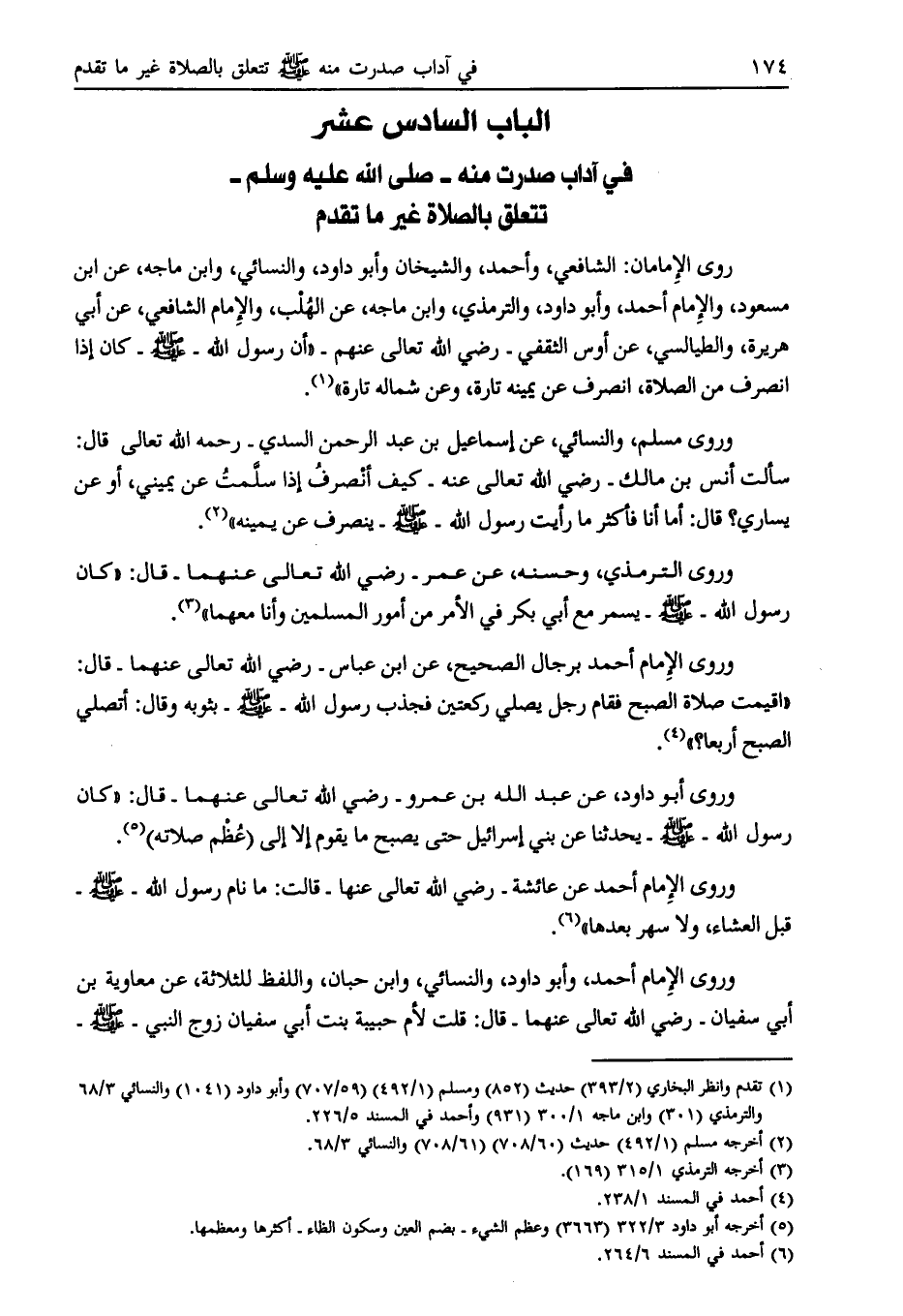 روى الإمامان: الشافعي، وأحمد، والشيخان وأبو داود، والنسائي، وابن ماجة، عن ابن مسعود، والإمام أحمد، وأبو داود، والترمذي، وابن ماجة، عن الهلب، والإمام الشافعي، عن أبي هريرة، والطيالسي، عن أوس الثقفي- رضي الله تعالى عنهم- «أن رسول الله- صلى الله عليه وسلم- كان إذا انصرف من الصلاة، انصرف عن يمينه تارة، وعن شماله تارة» [ (1) ] .